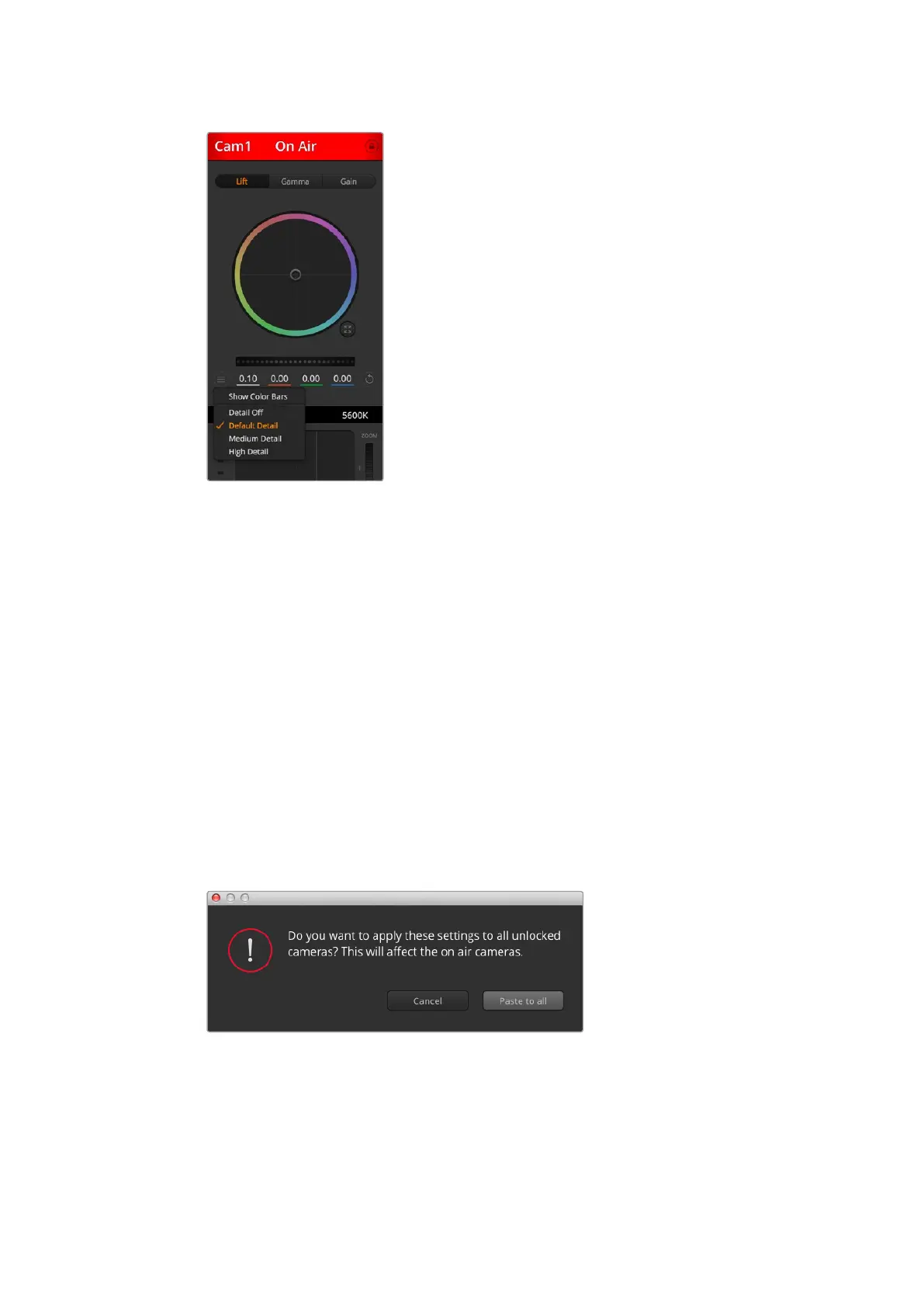 zurücksetzen. Sie können Farbkorrektureinstellungen in einzelne Kamerabedienfenster kopieren