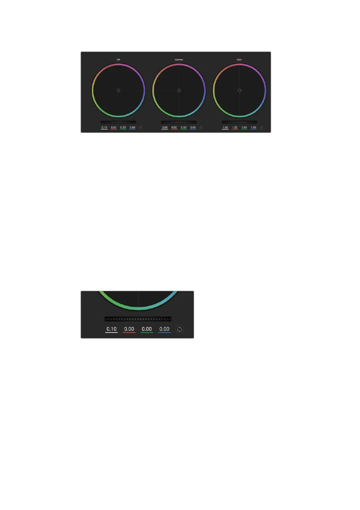 Benutzen Sie die Masterräder unter den Farbrädern, um die „Lift“-, „Gamma“- und „Gain“-