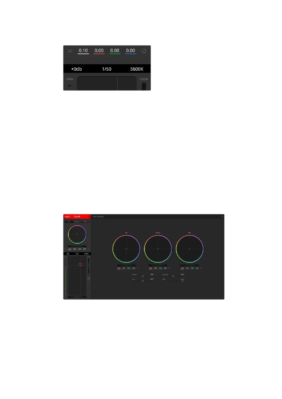 Your Blackmagic Studio Camera features a DaVinci Resolve primary color corrector built in.