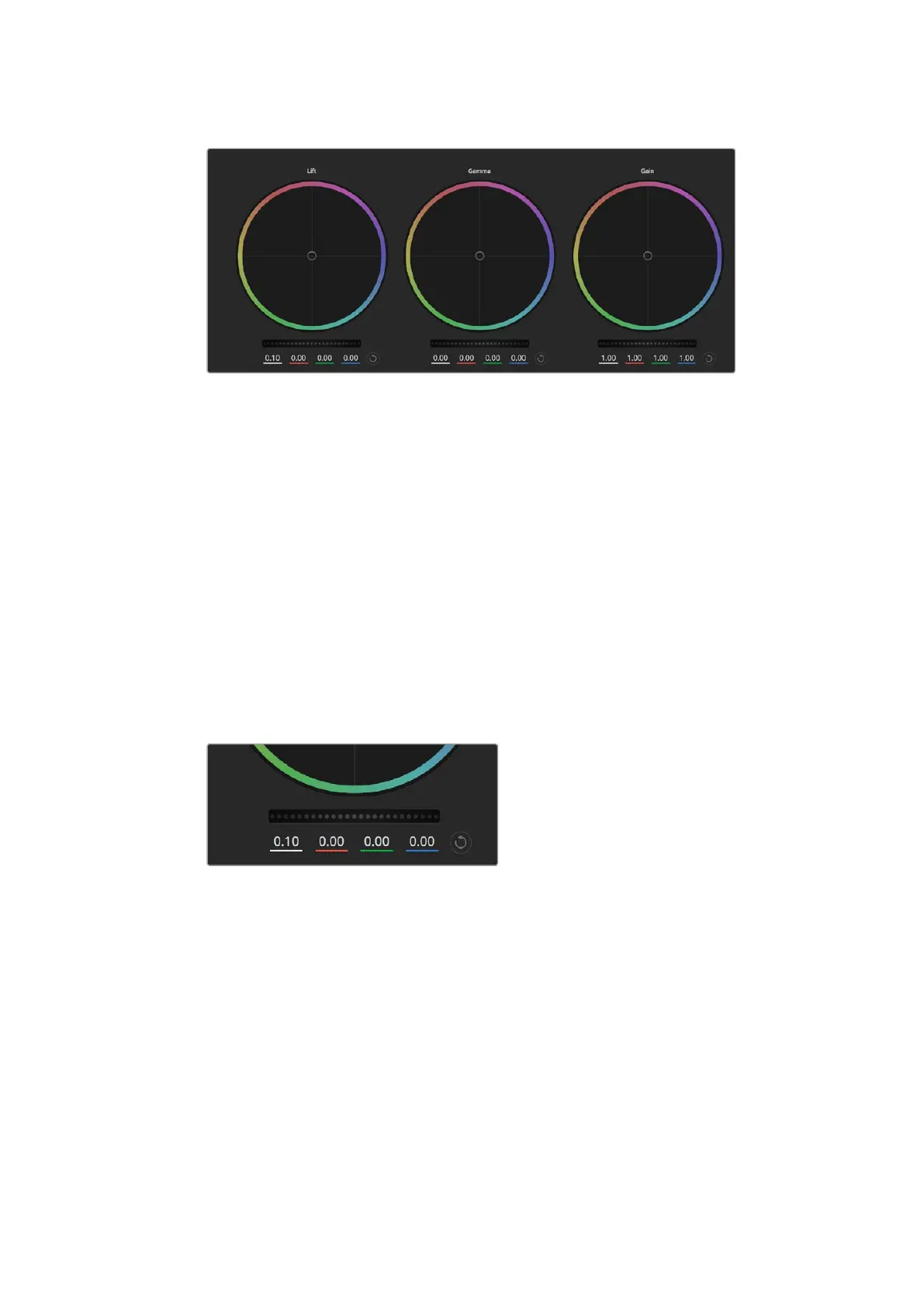 Use the master wheels below the color wheels to adjust each YRGB channels’ lift, gamma and