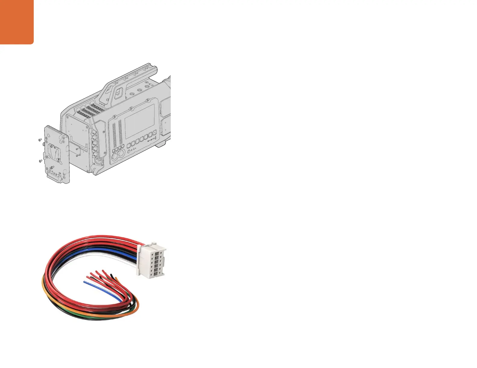 To mount a battery, you'll need to attach a Blackmagic V-mount battery plate, a third party V-mount