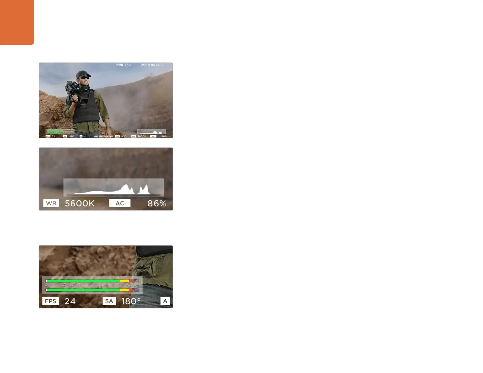 A histogram and audio meter can be turned on or off so you can monitor your exposure and audio levels.
