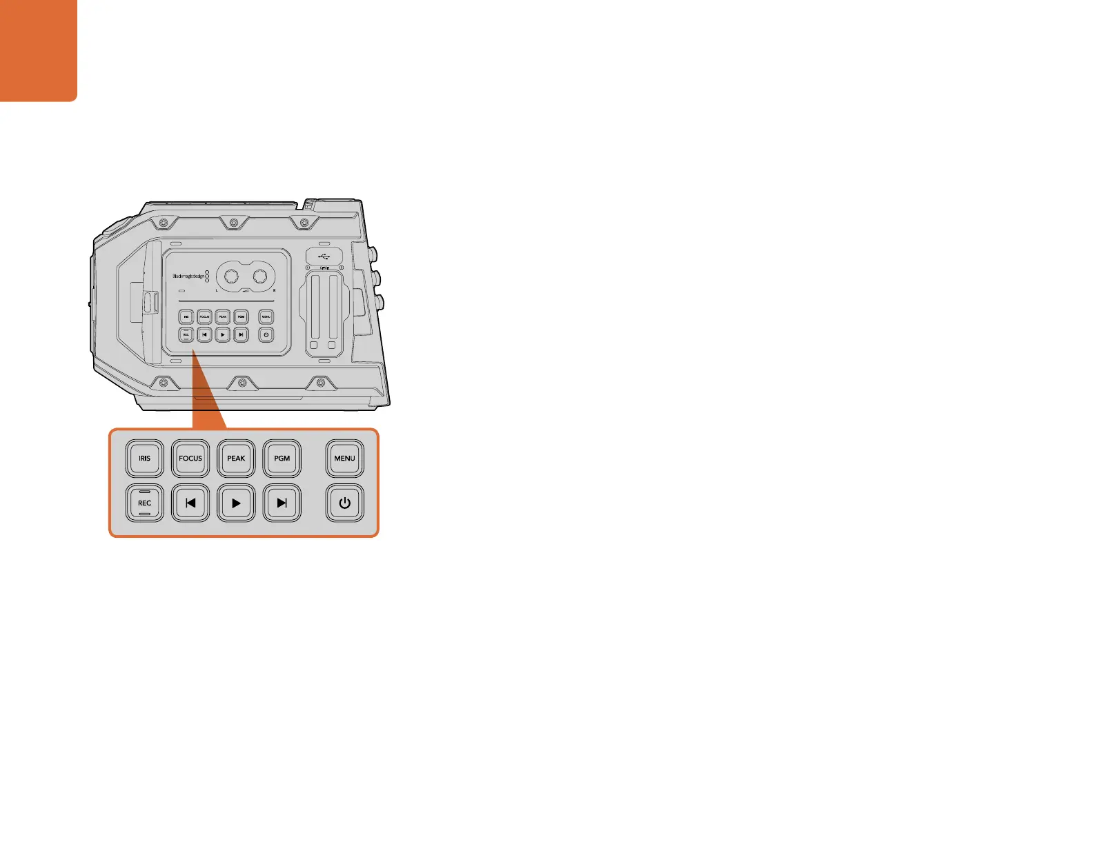 Your Blackmagic URSA Mini has control buttons on the left side of your camera behind the LCD, the