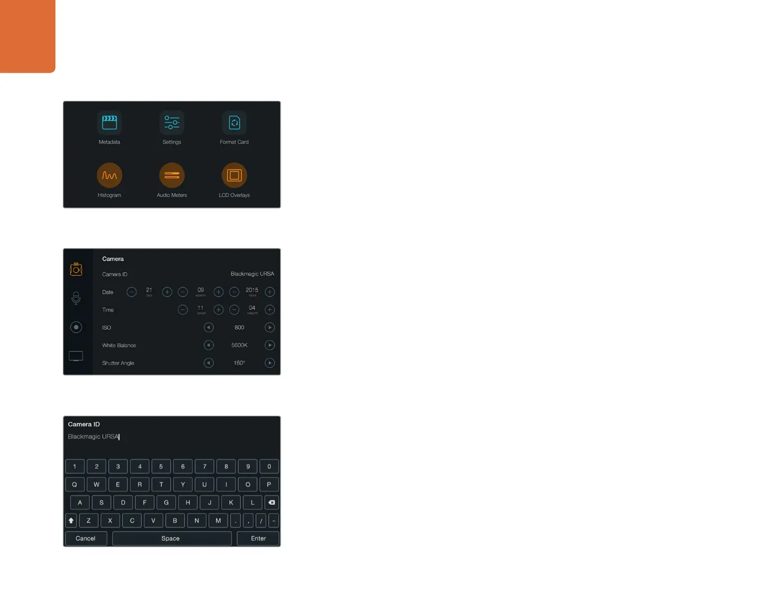 be included with any metadata recorded with your clips. Set the 'camera ID' with the touchscreen