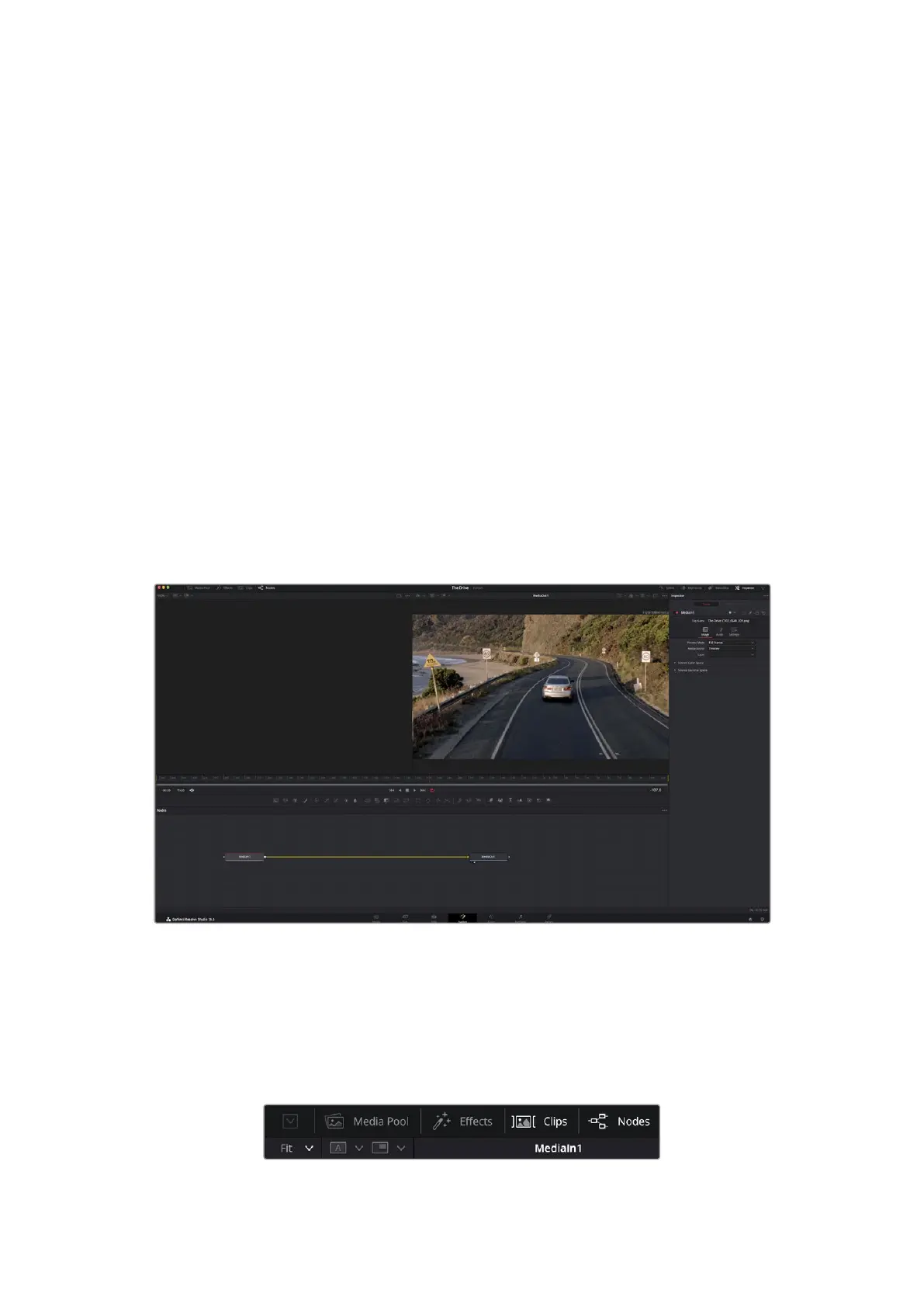 media, an inspector window to the right to access tool settings, and a nodes window at the