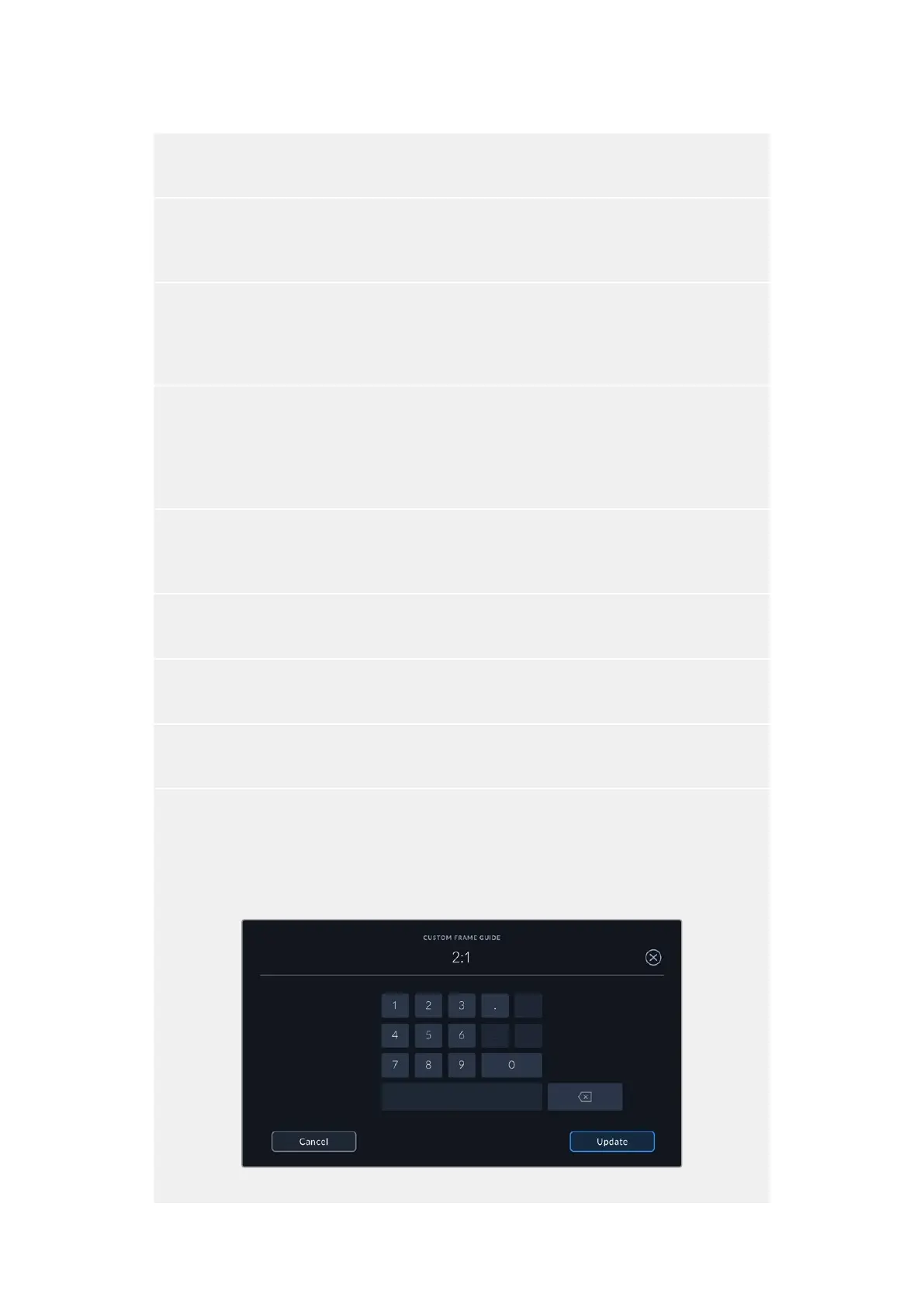 ratio, then use the numeric keypad to specify a new ratio. Tap ‘update’ to apply your custom frame