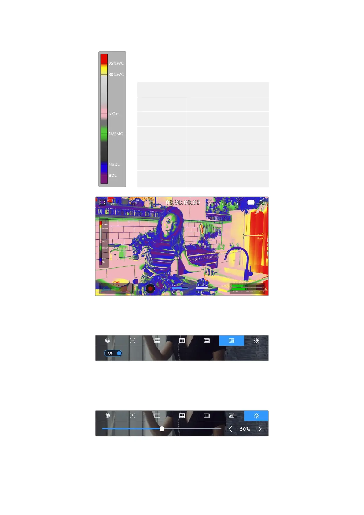 To toggle false color for the LCD touchscreen, tap the switch icon in the bottom left of the