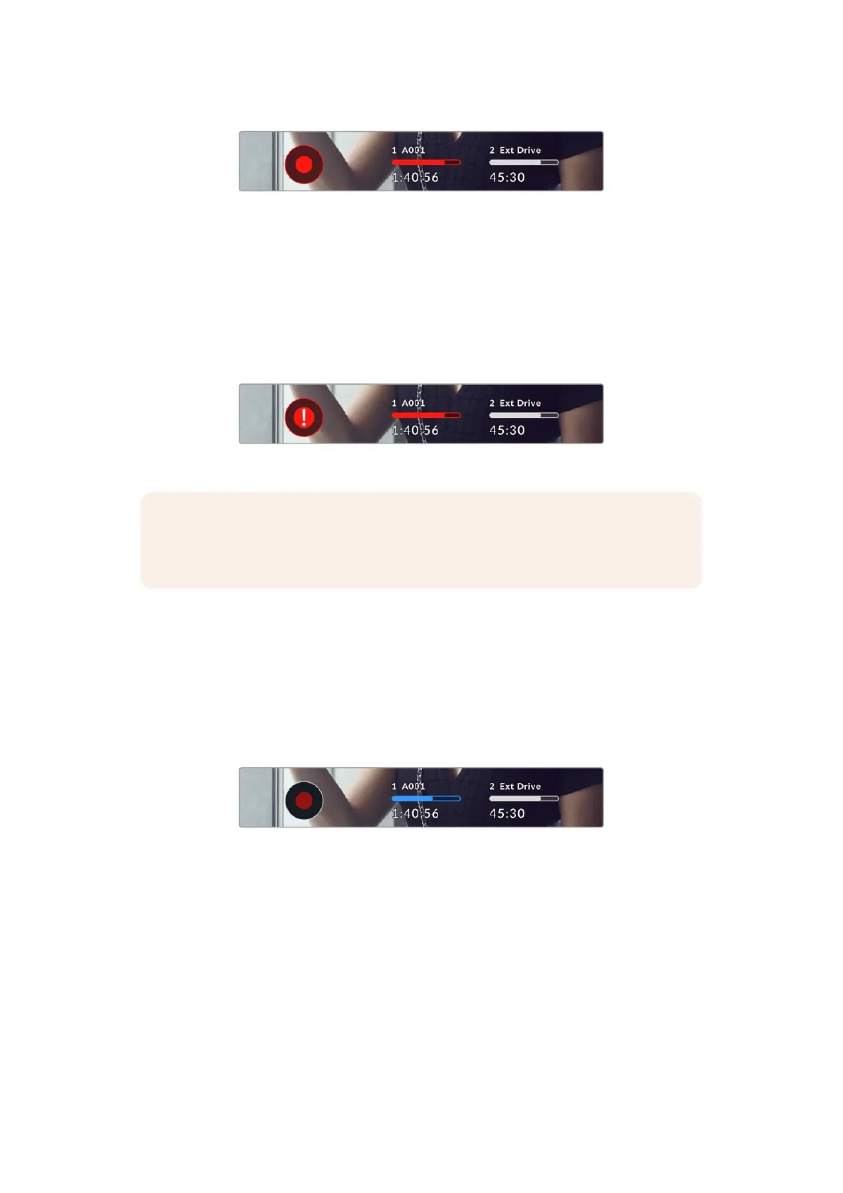 The ‘record’ button is overlaid with a flashing ‘!’ indicator if the CFexpress card or USB disk