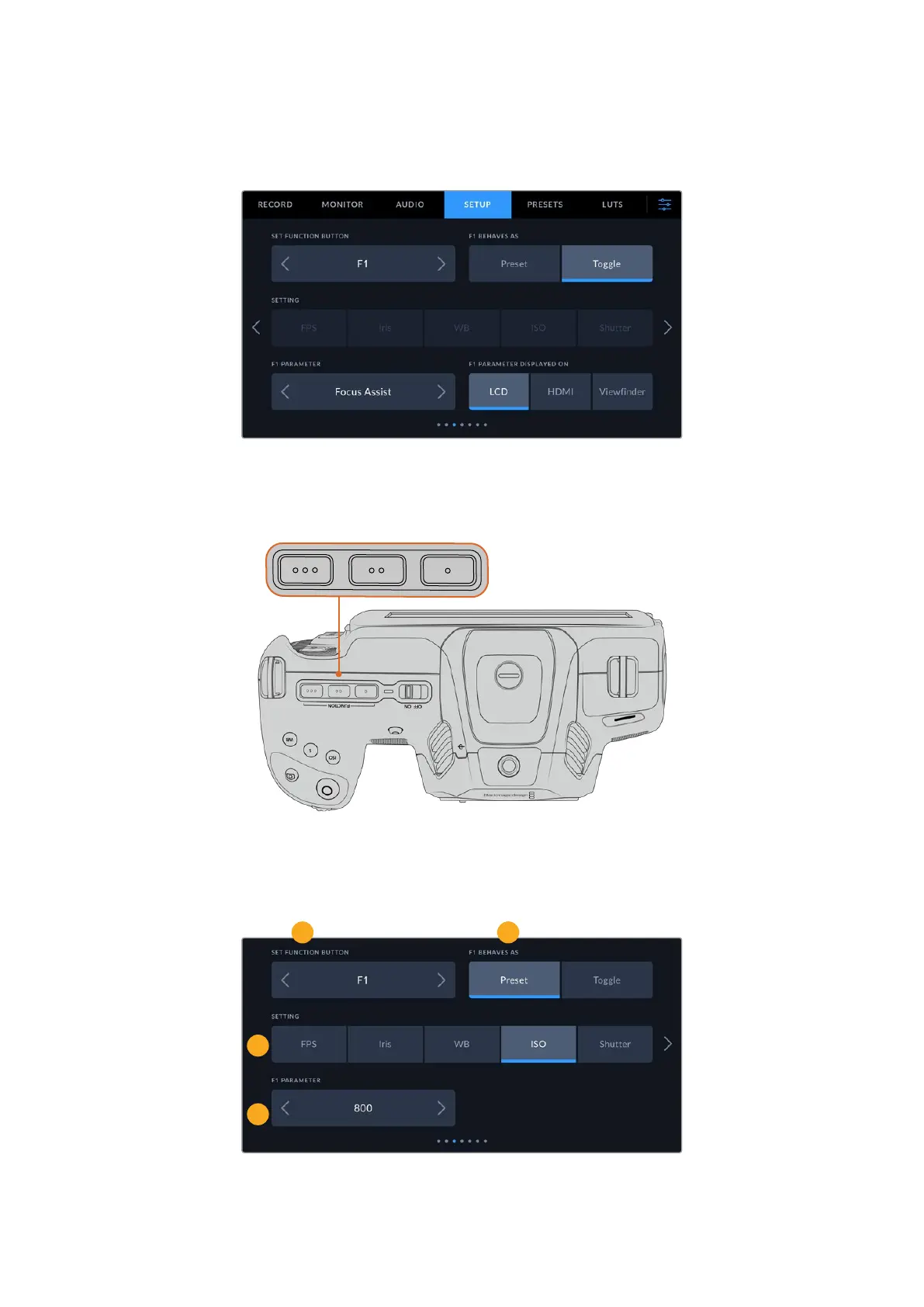 On the top of your Blackmagic Cinema Camera 6K you’ll notice three function buttons. Thedots