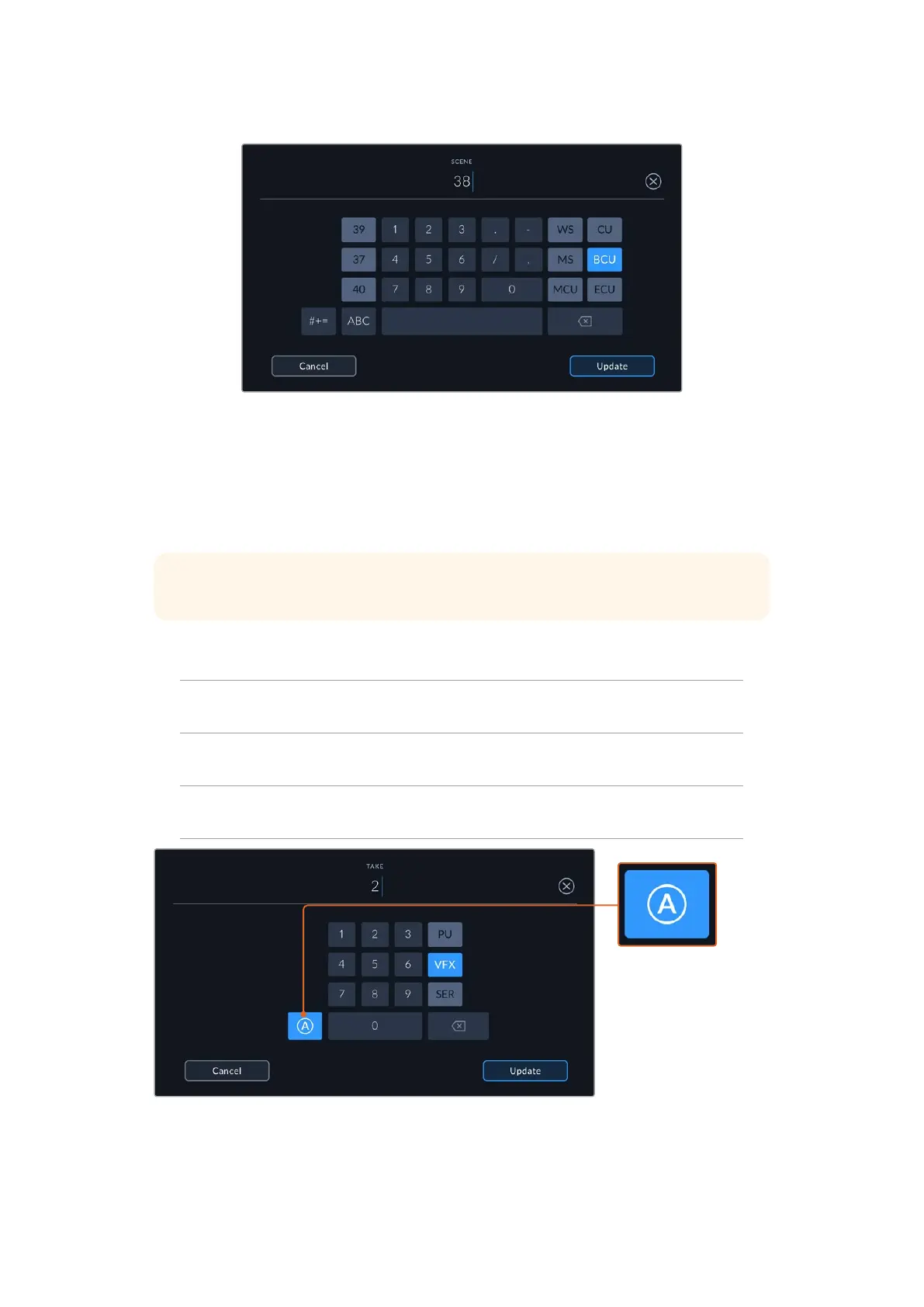 When entering ‘take’ metadata, your Blackmagic Cinema Camera 6K will offer prompts for additional shot types