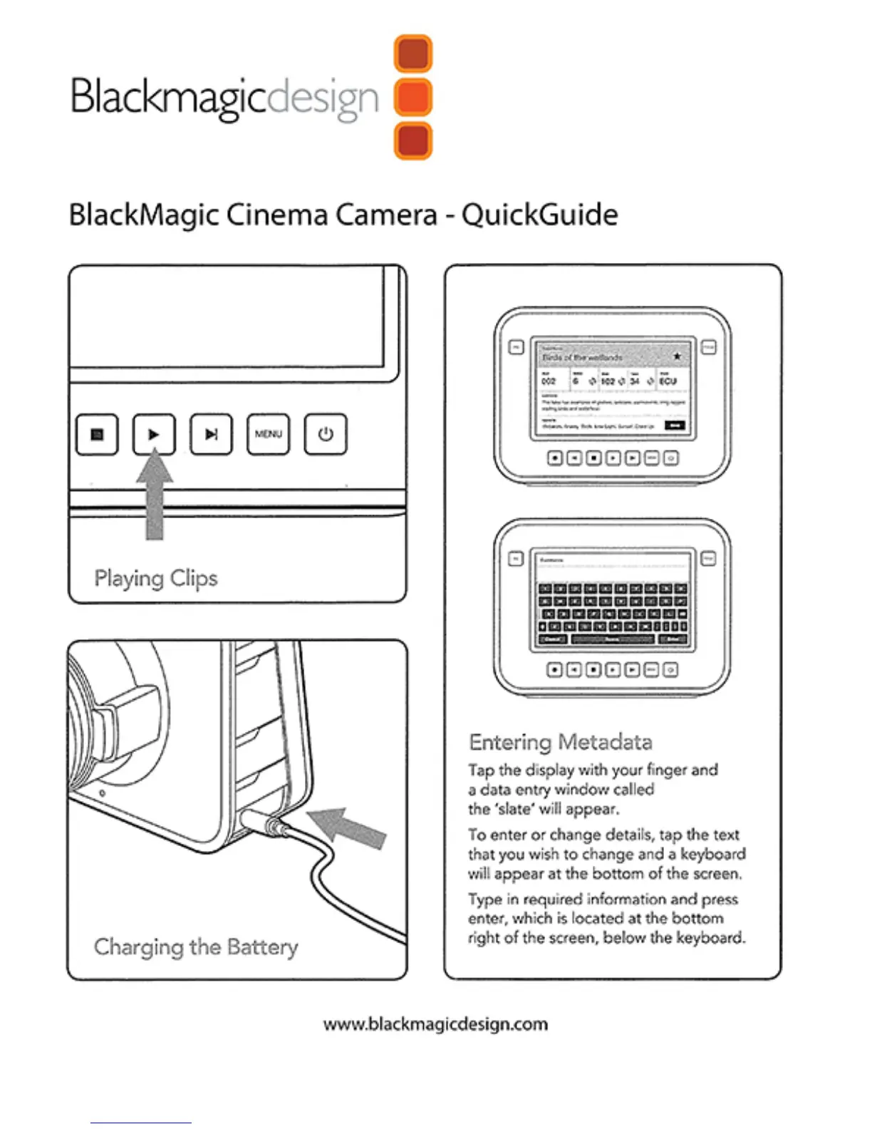 Blackmagicdesign Cinema Camera - Playback and Data Entry; Playing Clips; Entering Metadata; Battery Management