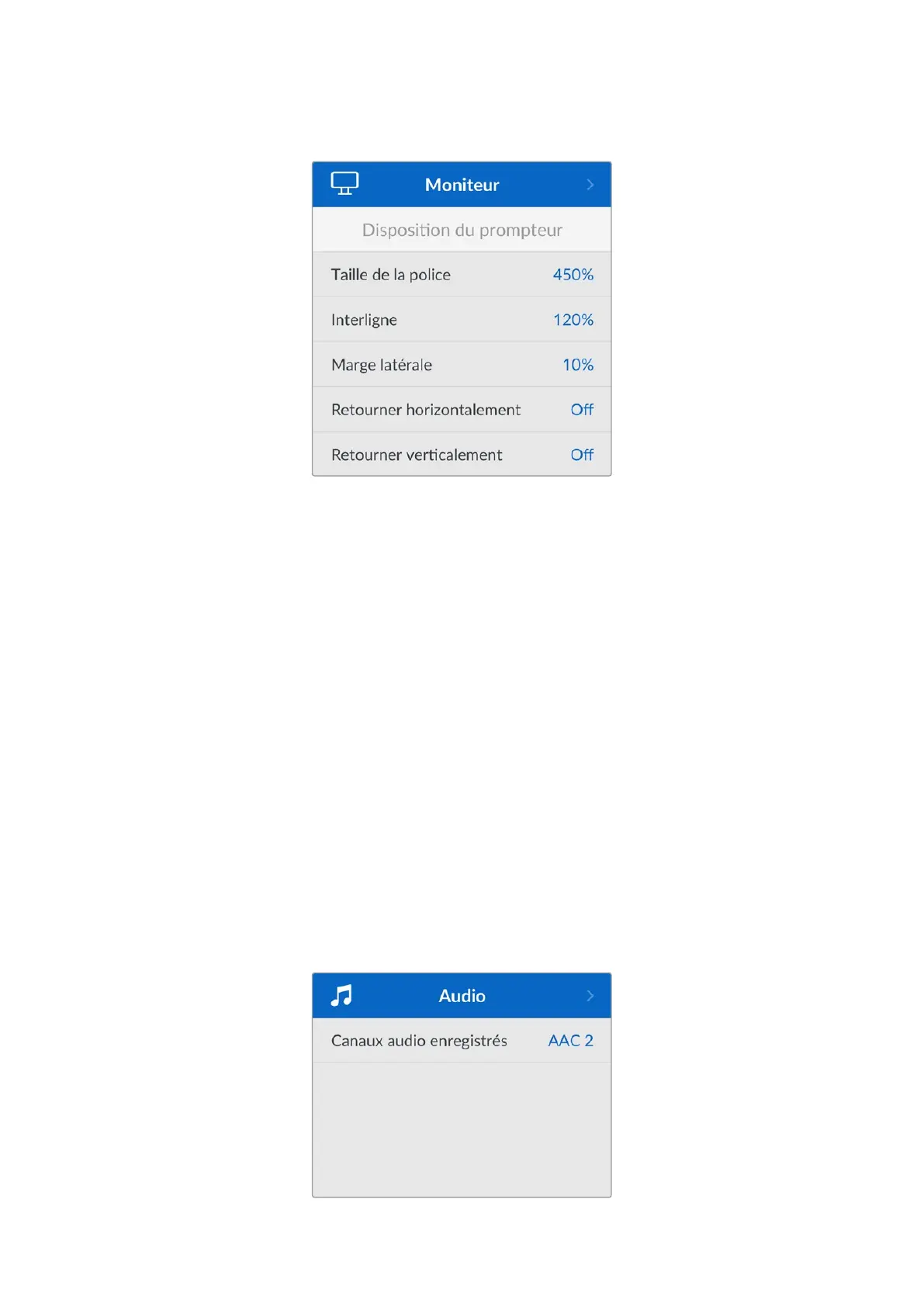 Le menu Moniteur contient tous les paramètres pour l’utilisation de l’HyperDeck Shuttle HD