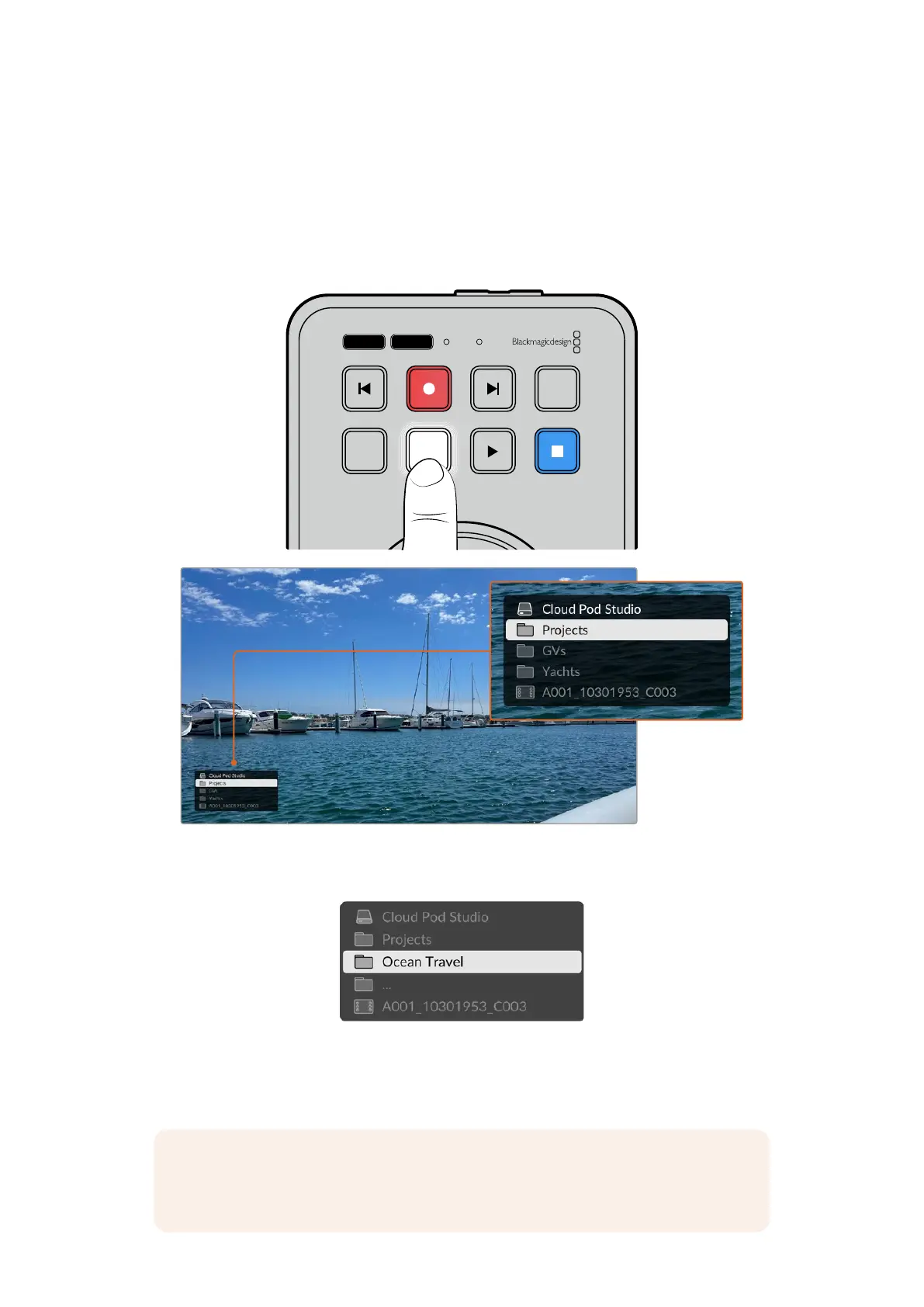superposition apparaît sur la sortie HDMI et vous pouvez parcourir les répertoires à l’aide du bouton