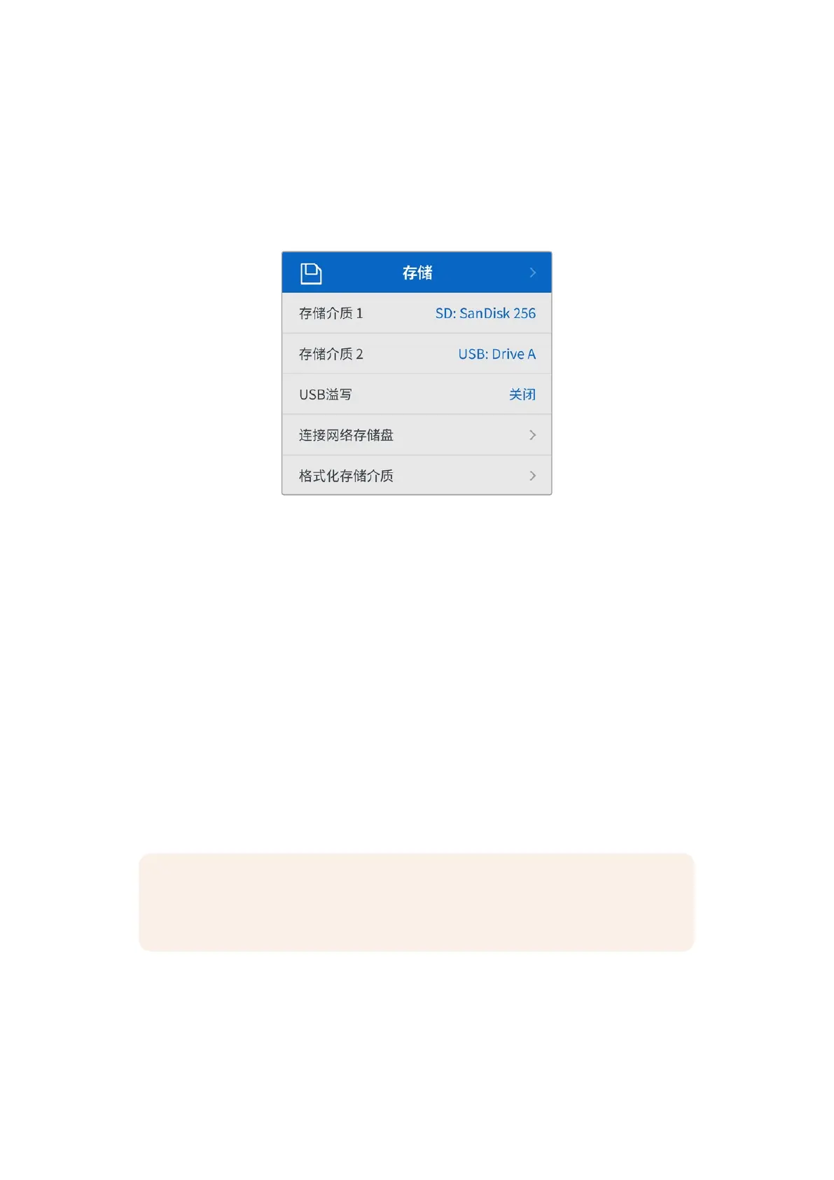 连接的存储介质将会显示在存储设置中。存储介质 1会显示所连接的SD卡名称列表,存储介质 2会显示