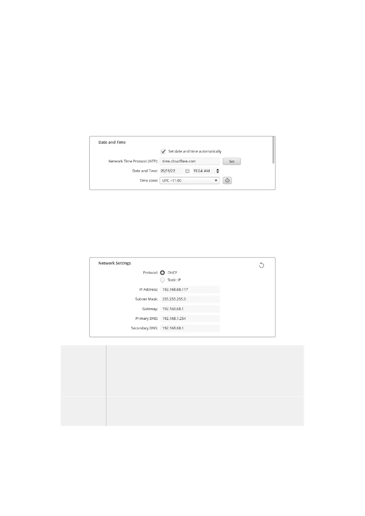HyperDeck Shuttle HD가 NTP 필드에서 설정된 네트워크 시간 프로토콜 서버를 사용합니다. NTP