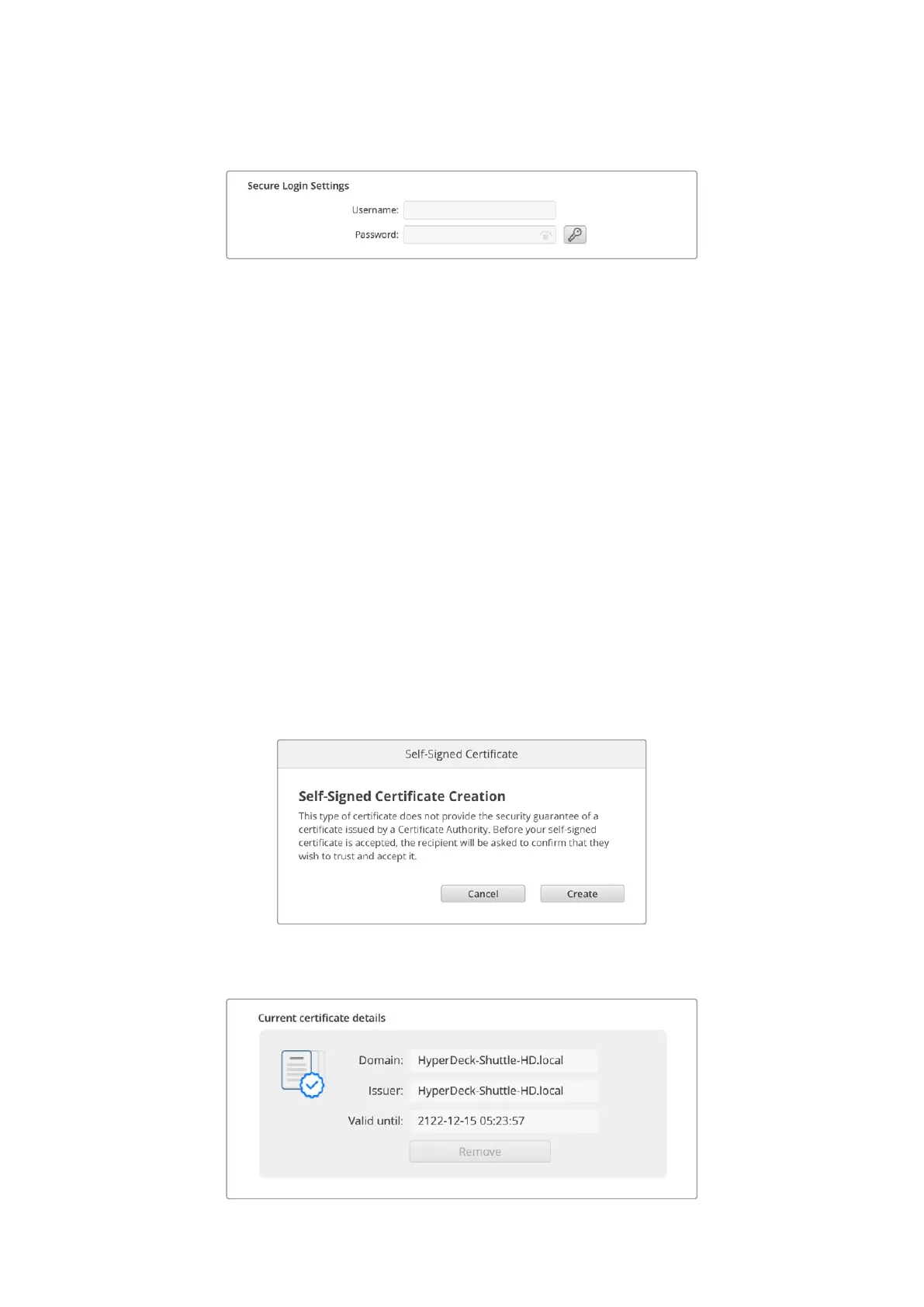 HyperDeck Shuttle은 인증 기관에서 서명받은 보안 인증서나 자가 서명 인증서를 사용하는 두 가지