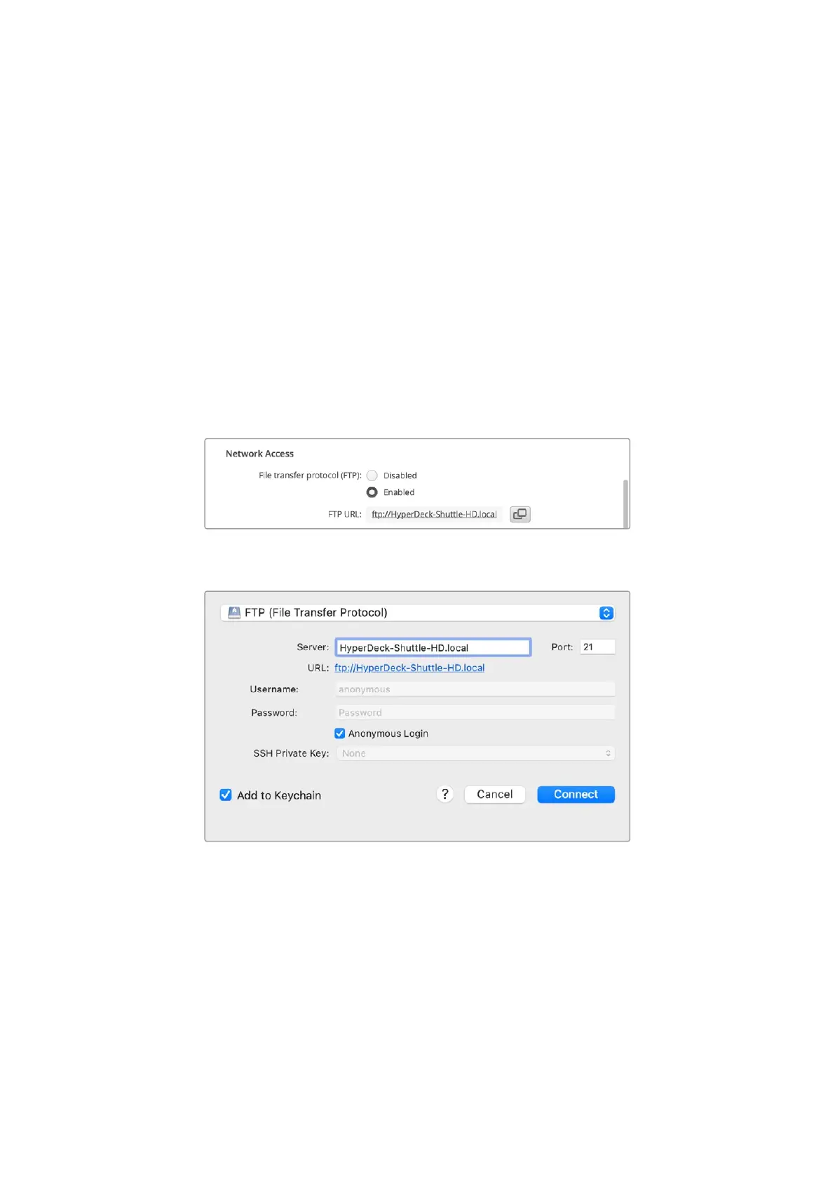 necessari un client FTP e l’indirizzo IP del deck o l’URL FTP salvato nell’utility HyperDeck Setup.