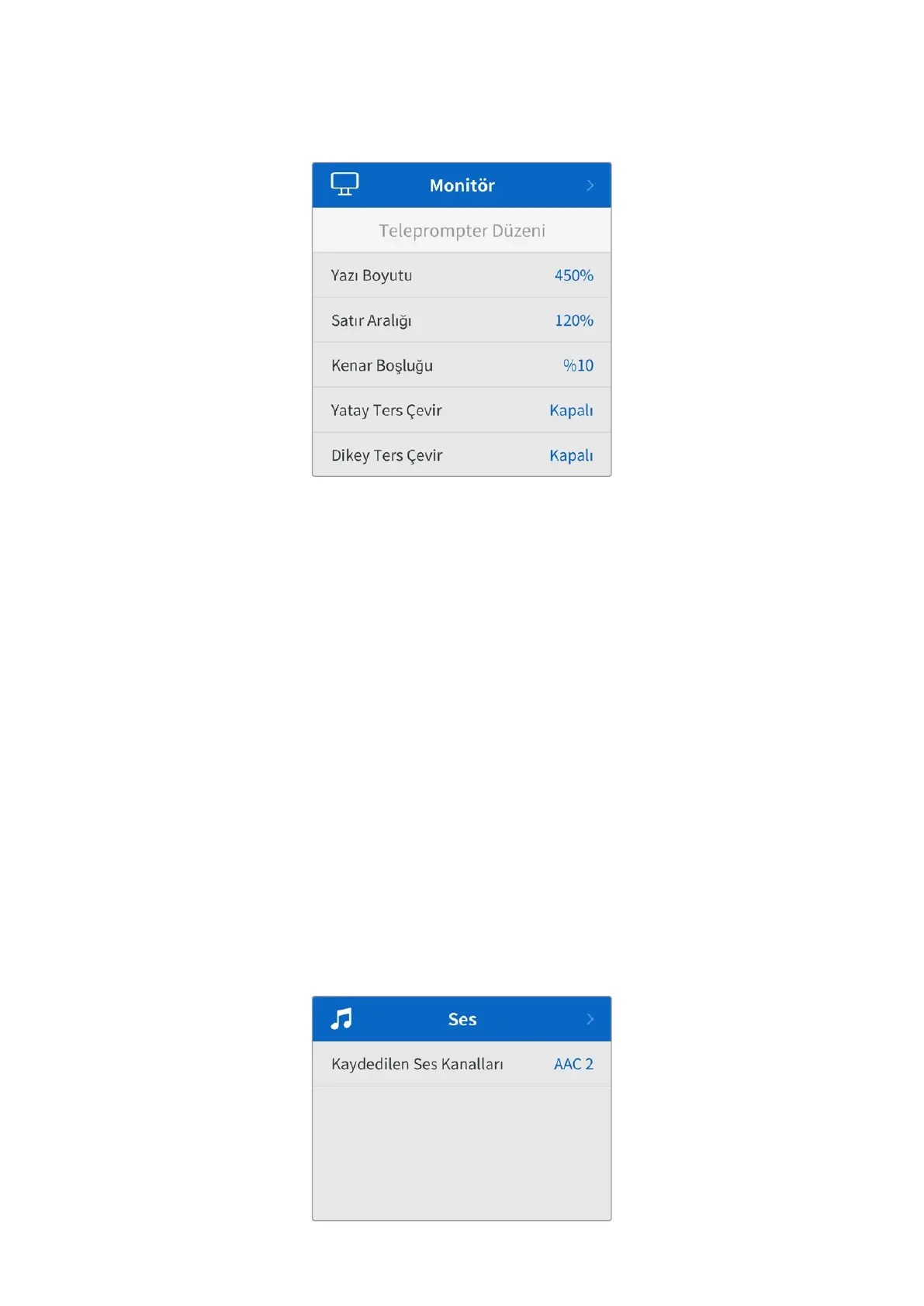 HyperDeck Shuttle HD'yi teleprompter olarak kullanmak için gereken tüm ayarlar monitör
