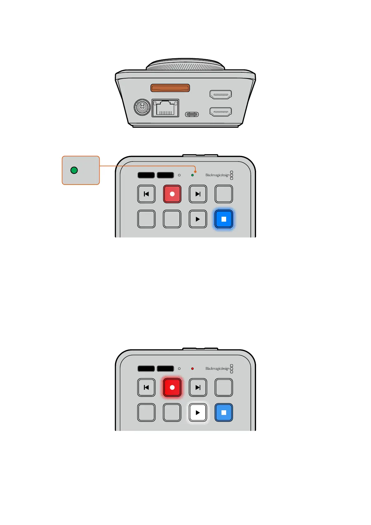 点灯し、収録および再生ボタンも点灯します。外付けディスクへ収録する際は、ディスクインジケーター