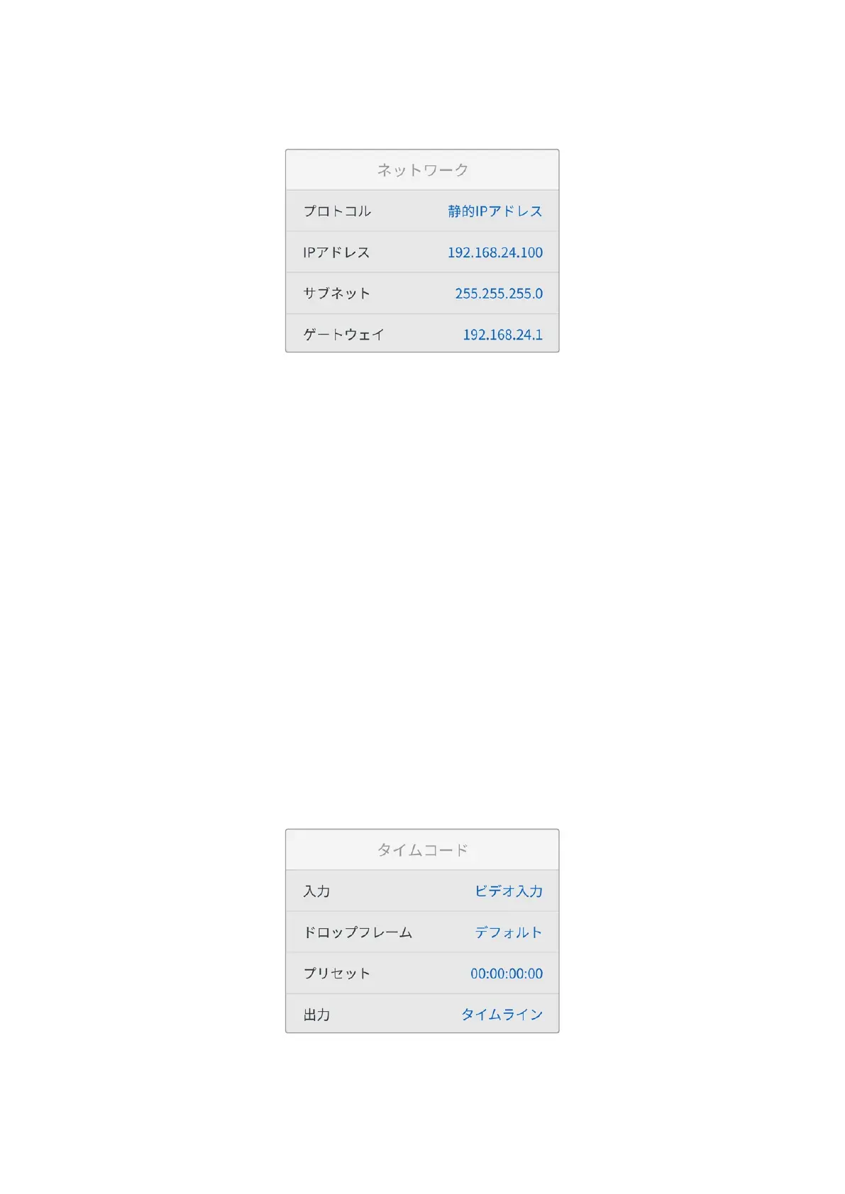 時刻タイムコードから選択するか、マニュアルで設 定するかなどを選択できます。