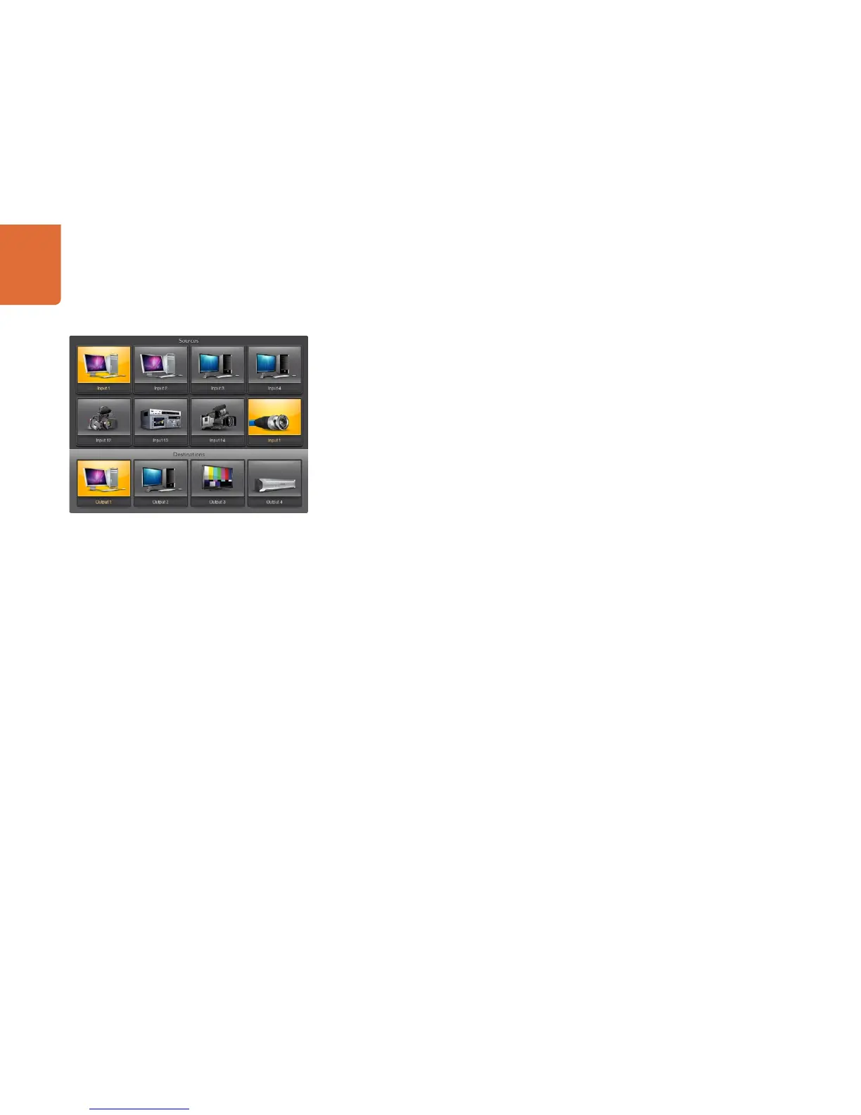 destination (output) pushbutton shows which source (input) is connected to it by illuminating the source