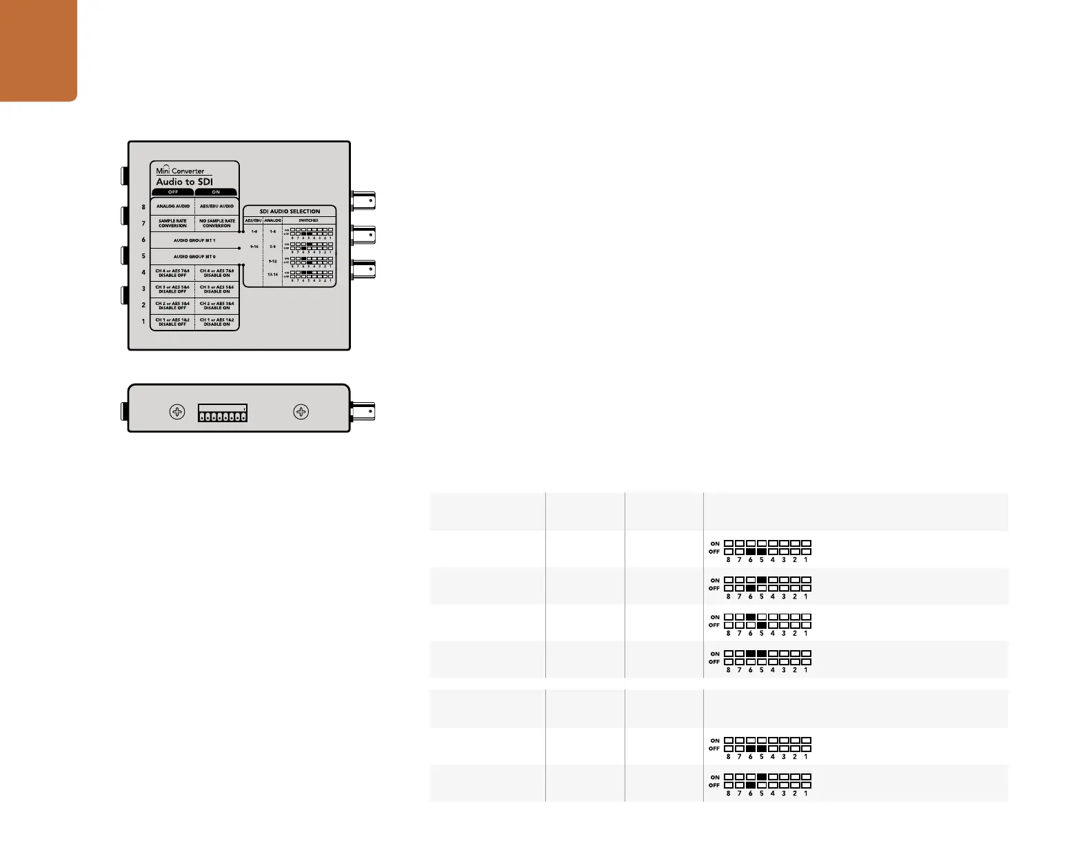 Mini Converter Audio to SDI’s mini switches provide the following settings: