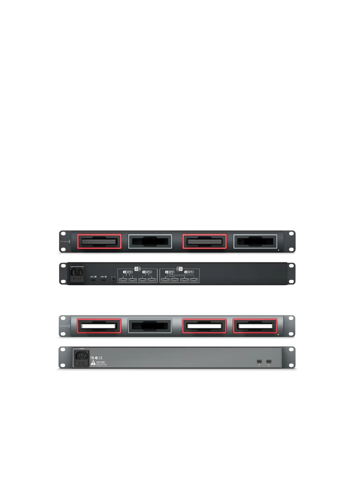 Blackmagic MultiDockは 、最 大 4枚 の ソ リ ッ ド ス テ ー ト ・ ド ラ イ ブ( SSD)ま た は ハ ー ド デ ィ ス ク ・ ド ラ イ ブ を