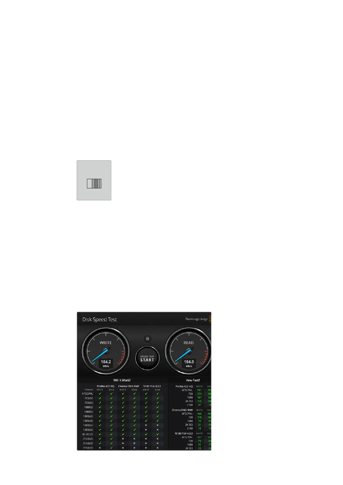 Anhand der Blackmagic Anwendung Disk Speed Test können Sie die Schreib- und Leseleistung Ihrer