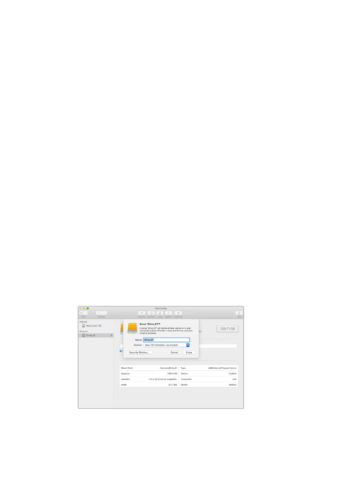 Mac OS의 디스크 유틸리티를 사용하여 ‘Mac OS Extended (Journaled)’ 또는 ‘exFAT’