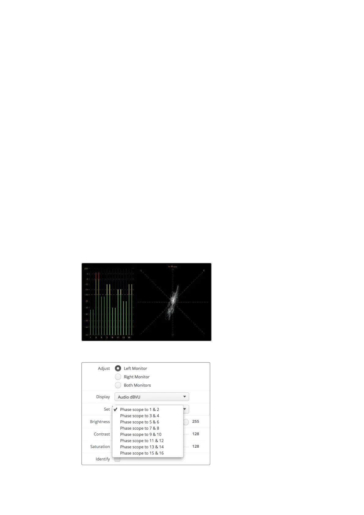 The right hand audio scope can monitor two channels of audio, which can be selected from the