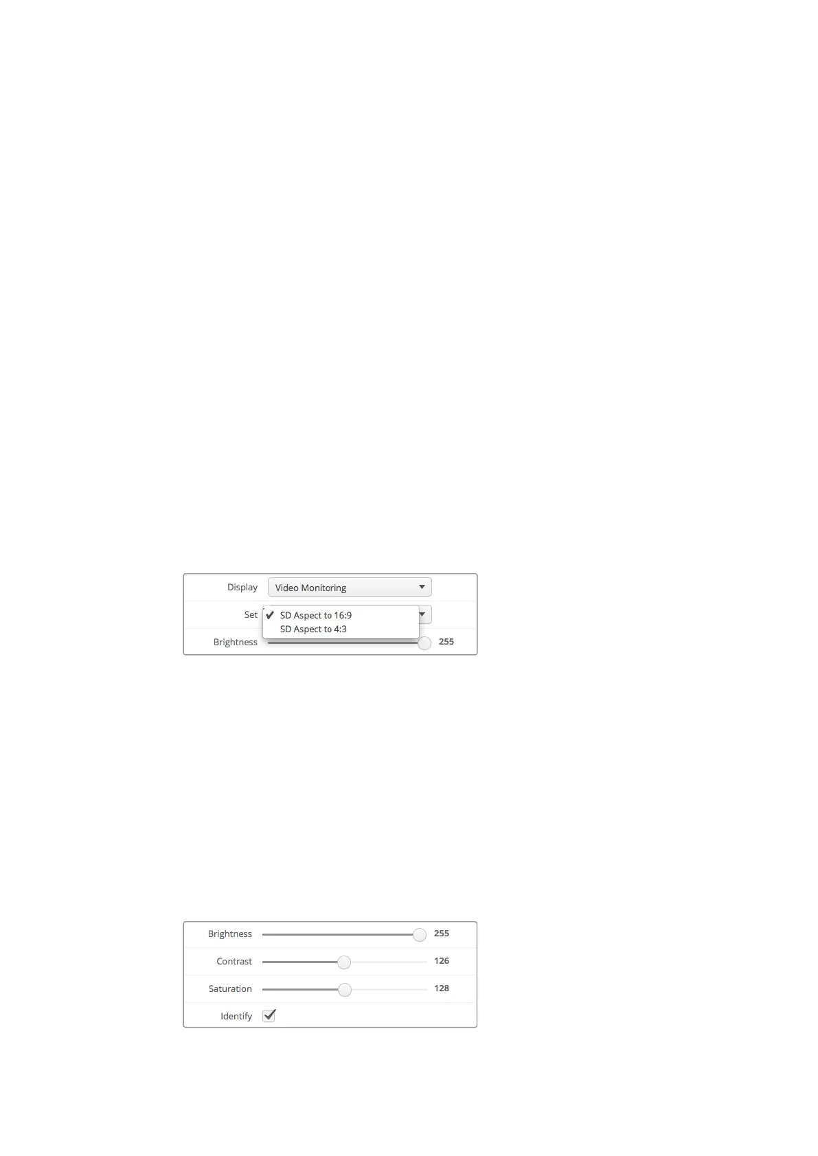 the video monitoring display when using standard definition video. The ‘set’ drop down menu