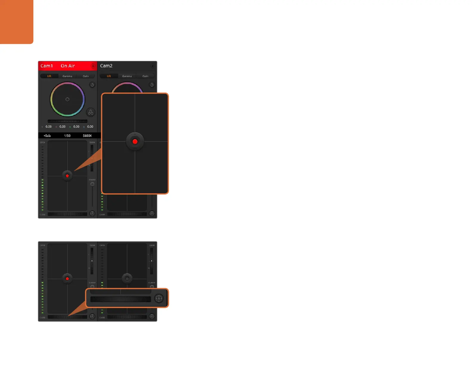 The iris/pedestal control is located within the cross hairs of each camera controller. The control