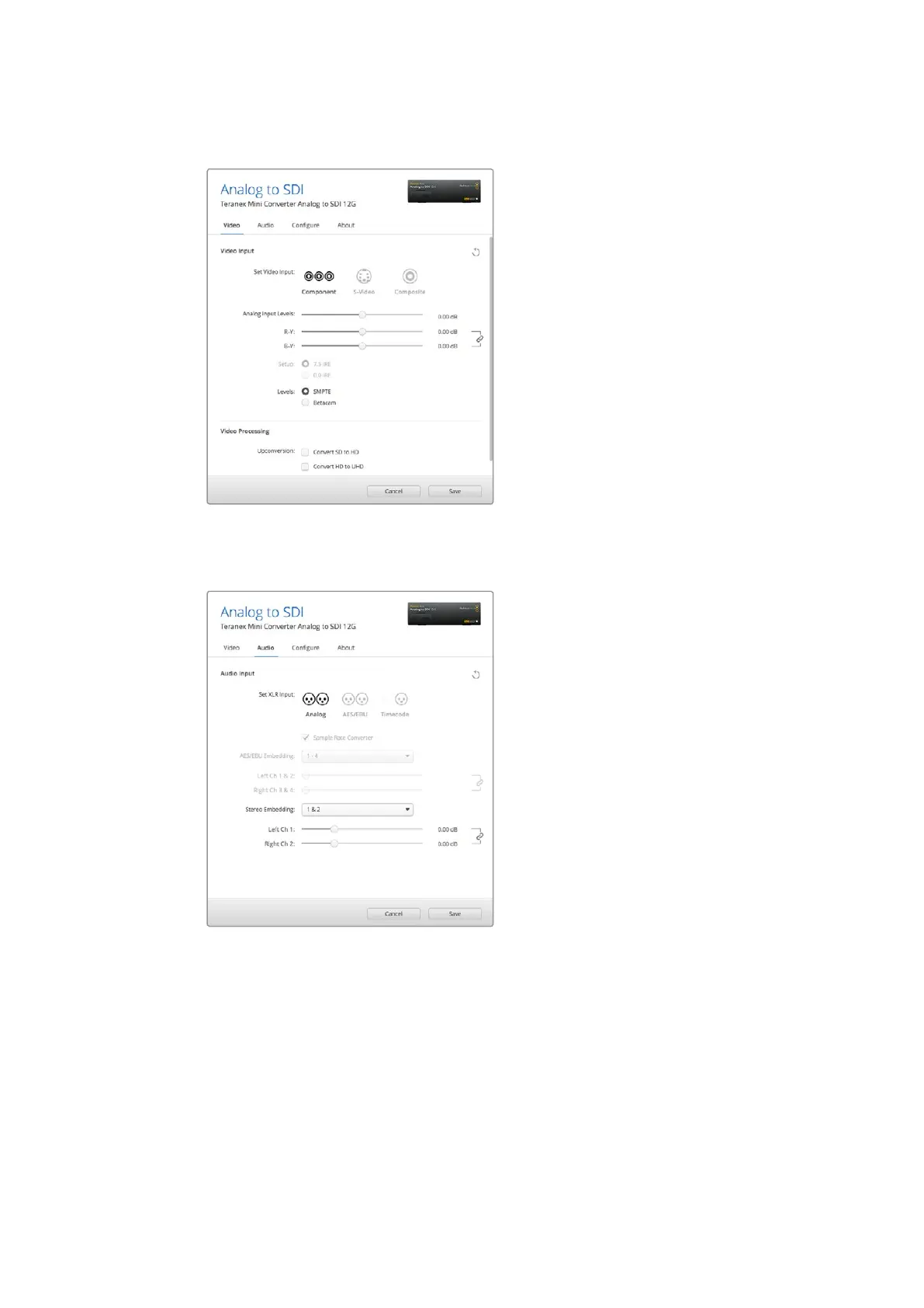 The ‘audio’ tab for Teranex Mini Analog to SDI 12G contains the following settings.