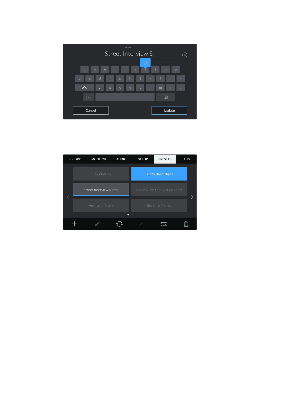 you want to update the preset with your URSA Broadcast's current setting. Tap ‘update’