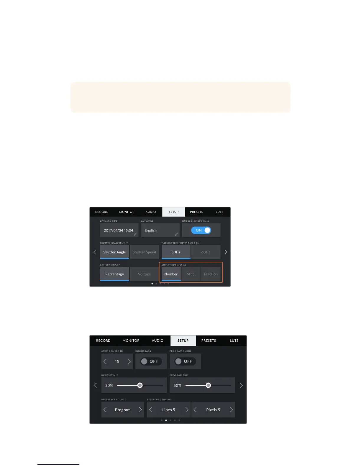 The second page of your URSA Mini's 'setup' tab contains the following settings.