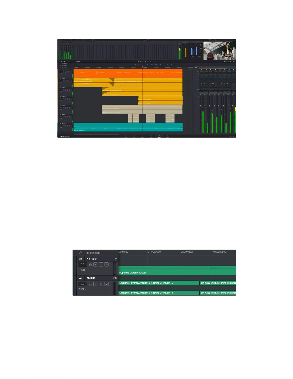 Each track on the Fairlight page is divided into lanes, which show each individual channel of clip