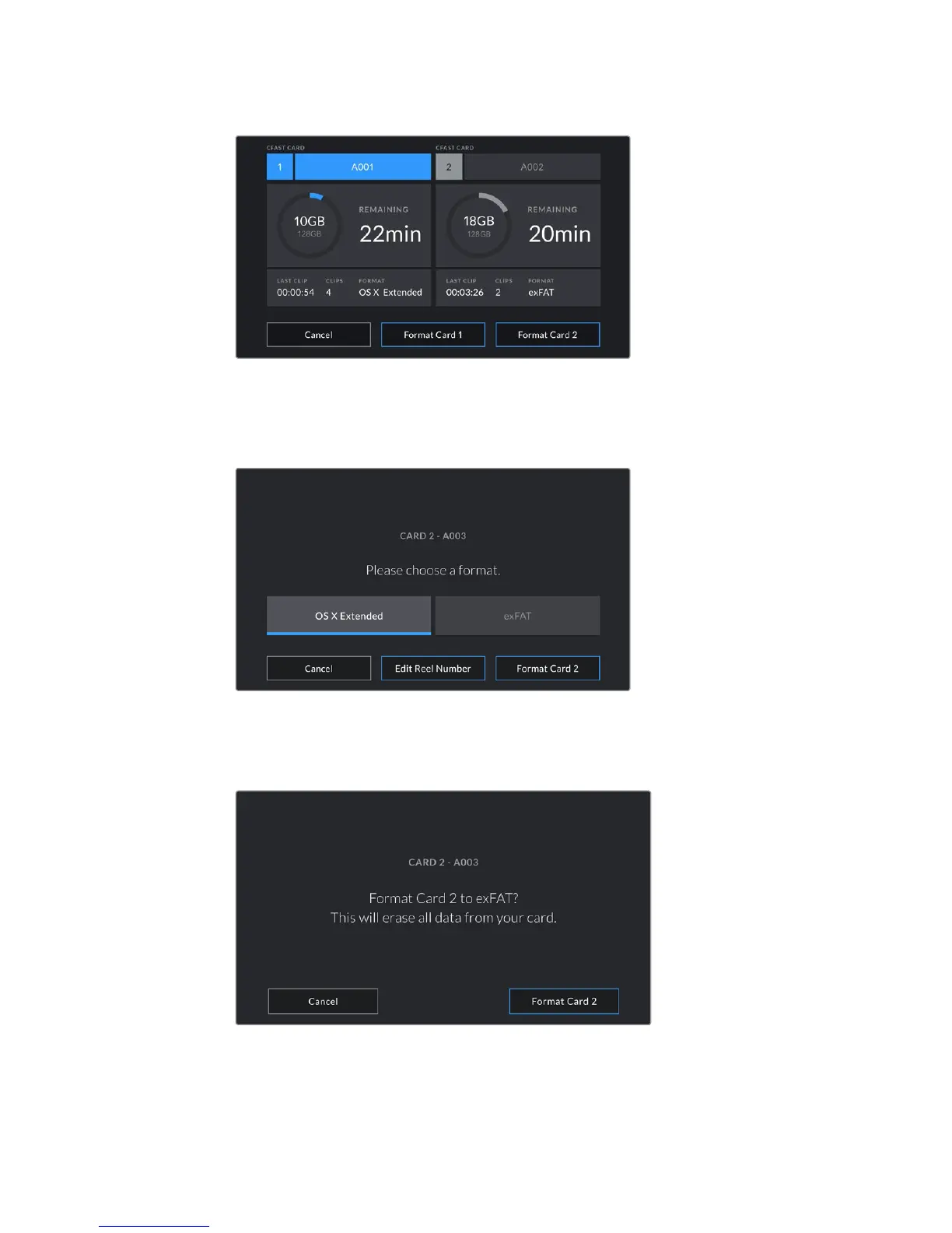 Use your URSA Mini's storage manager to format your camera's CFast cards