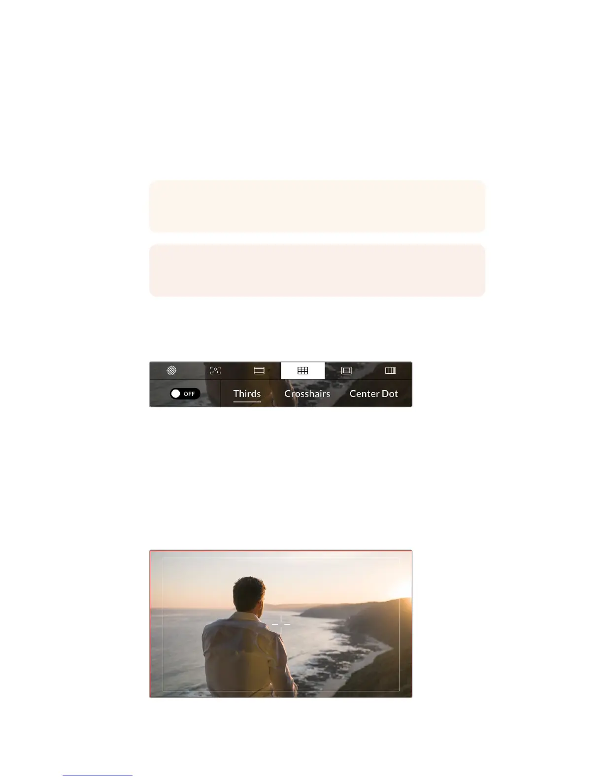 enabled, your URSA Mini can show a rule of thirds grid, crosshairs, or center dot.
