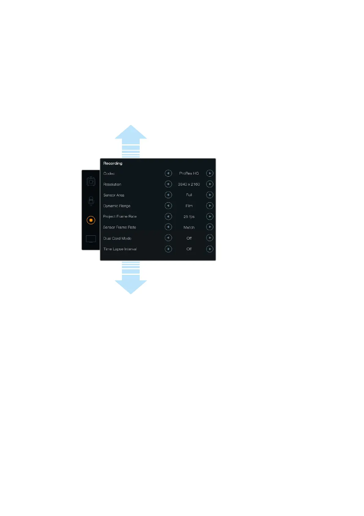 カードに 収 録するビデオフォーマットの設 定には 、丸いレコーダーアイコンをタップし、関 連の