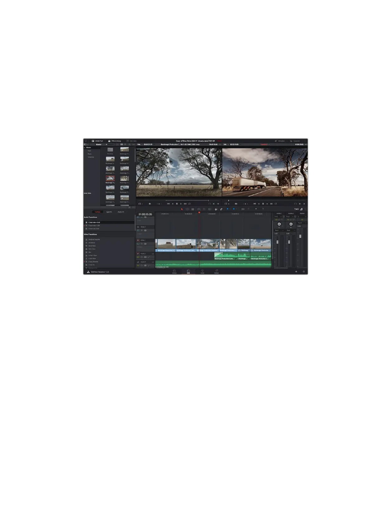 「エディット」ページ。タイムラインエディターを 使 用して、クリップのトリム 、順 番 の 変 更、移動 、トランジション