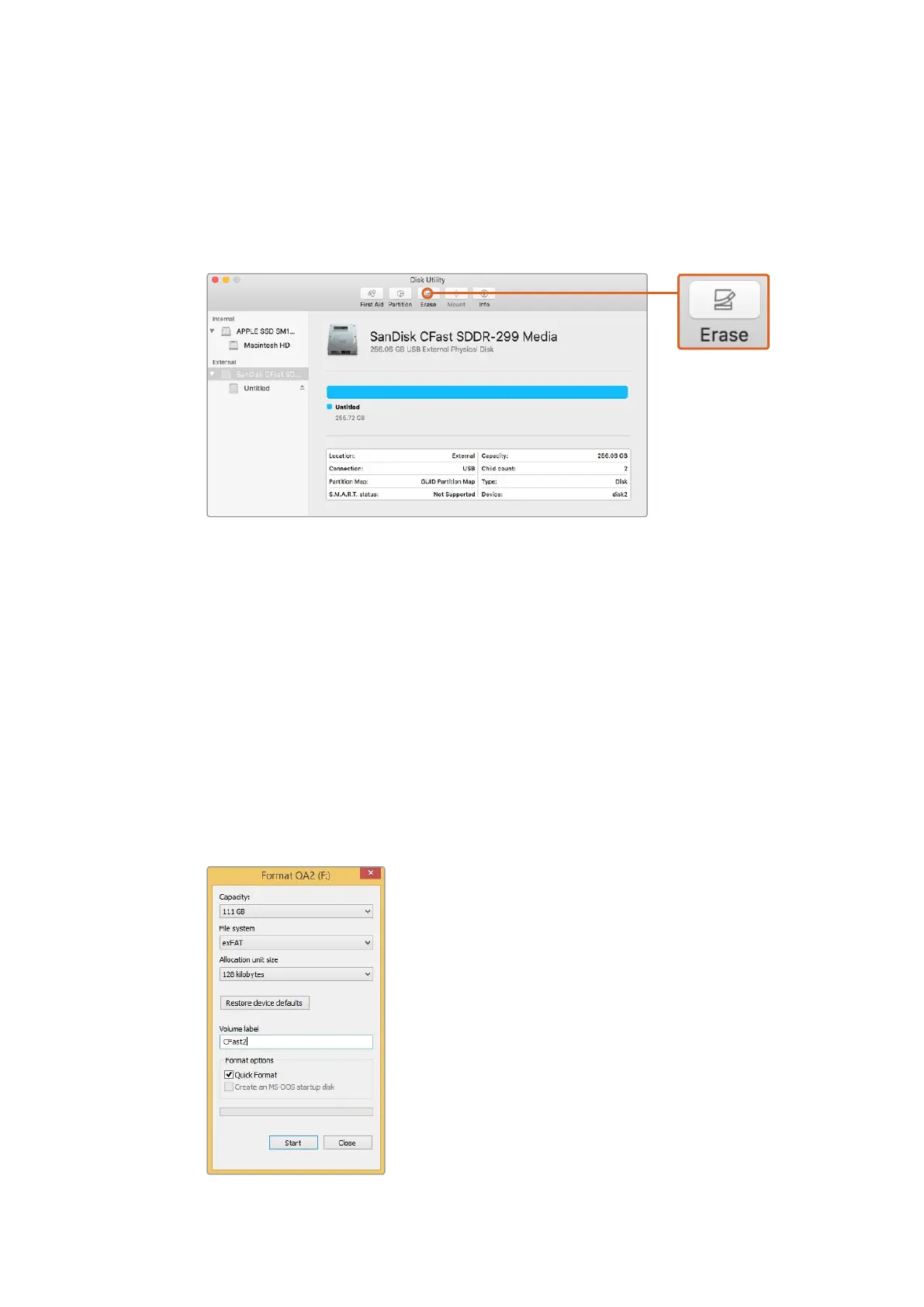 3 Klicken Sie auf das Datenträgersymbol Ihrer CFast-Karte und dann auf die Registerkarte „Löschen“.