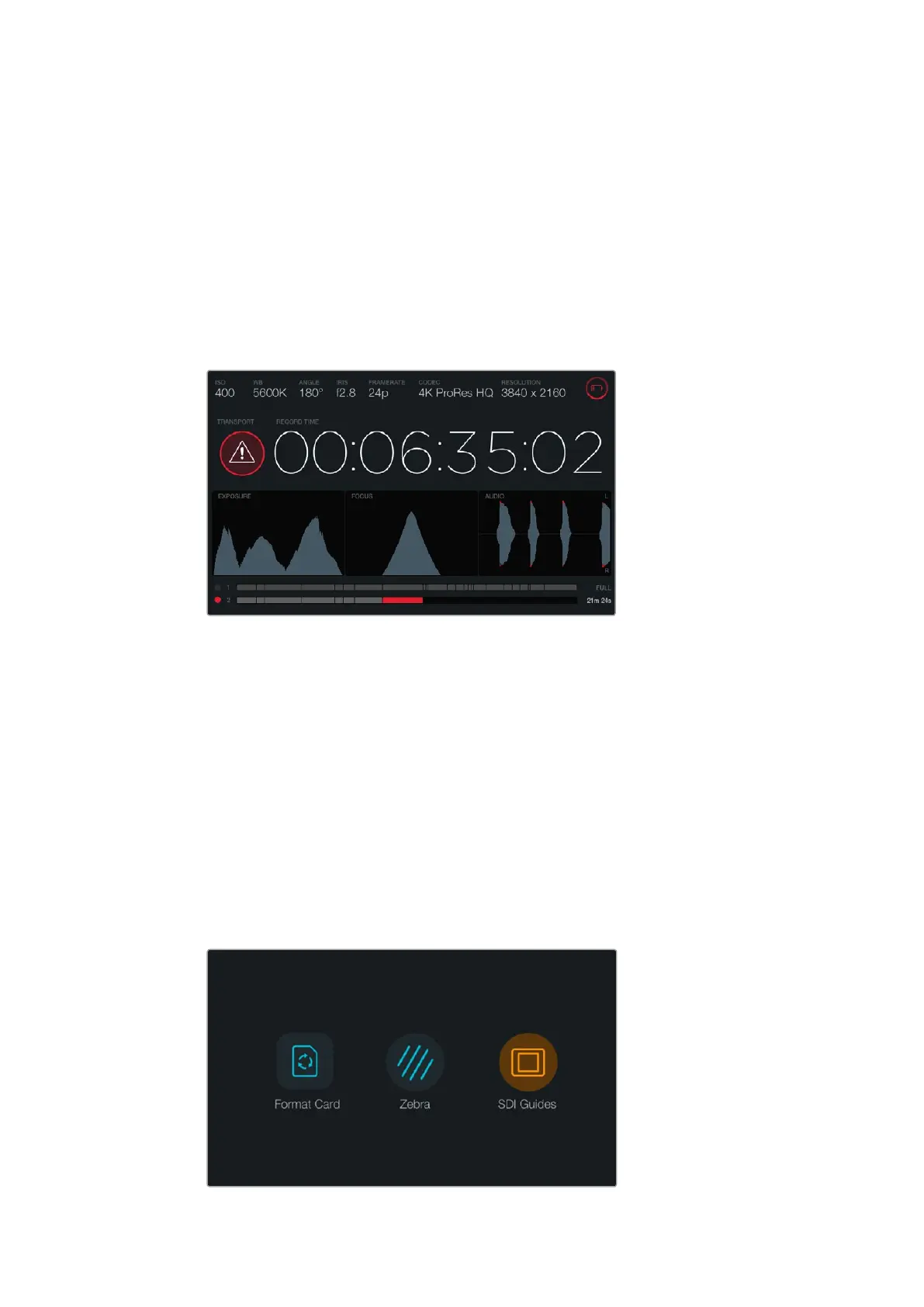 jeder Timeline zeigt die verbleibende Aufnahmezeit für beide CFast-Karten in Minuten und Sekunden