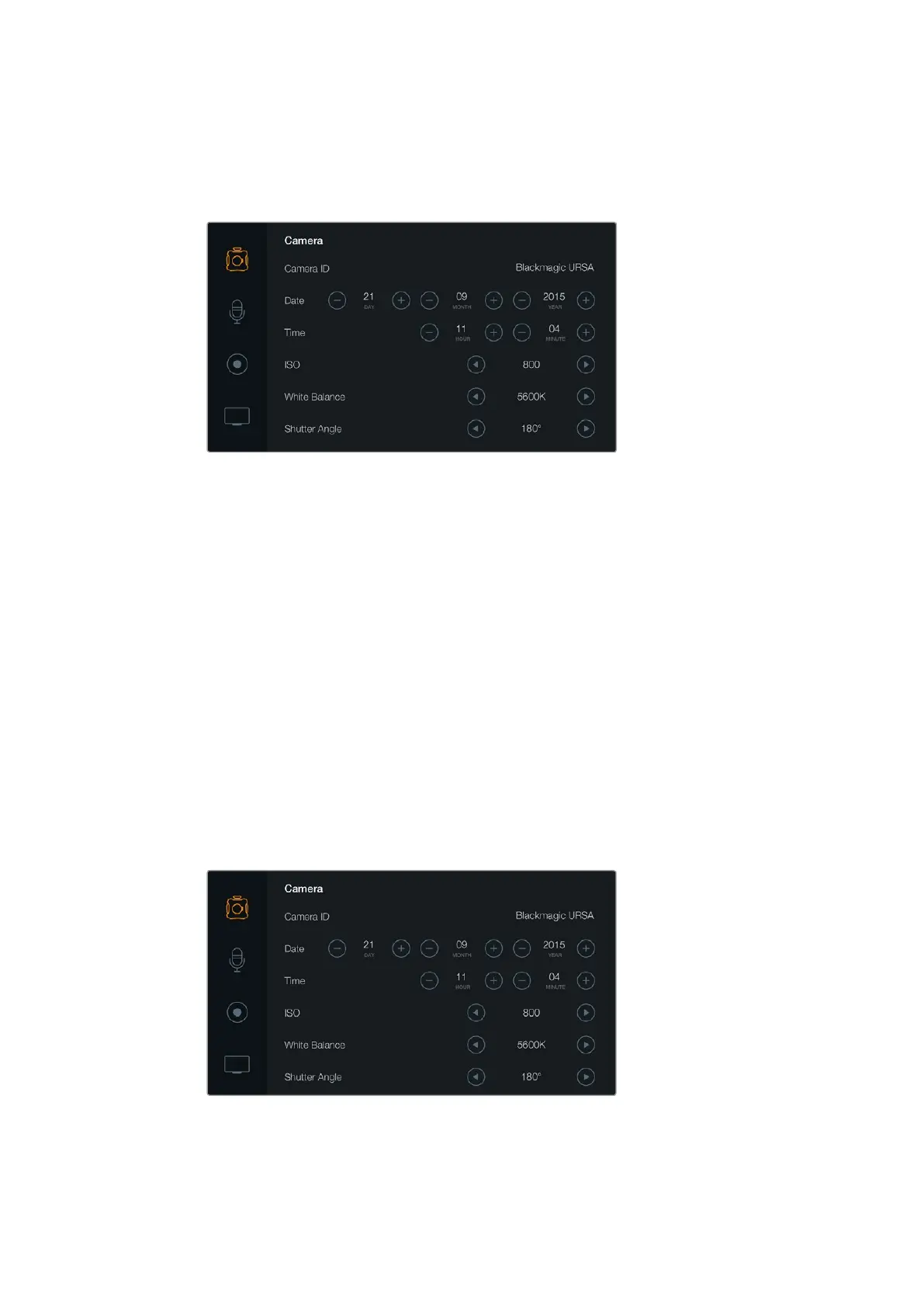 Stellen Sie Datum und Uhrzeit auf Ihrer Blackmagic URSA ein, indem Sie die Symbole „+“ oder „-“