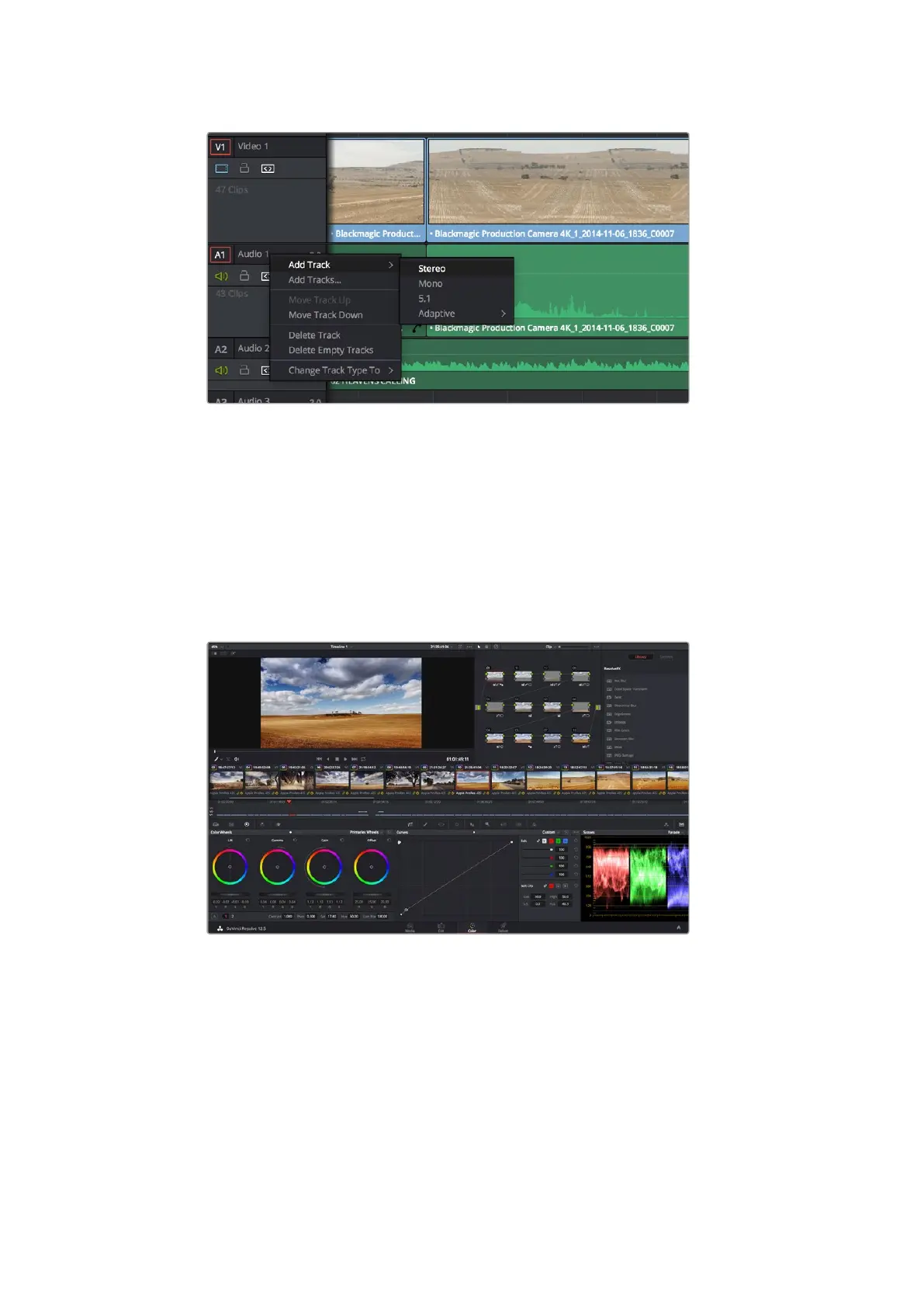 переключаться между страницами монтажа и цветокоррекции