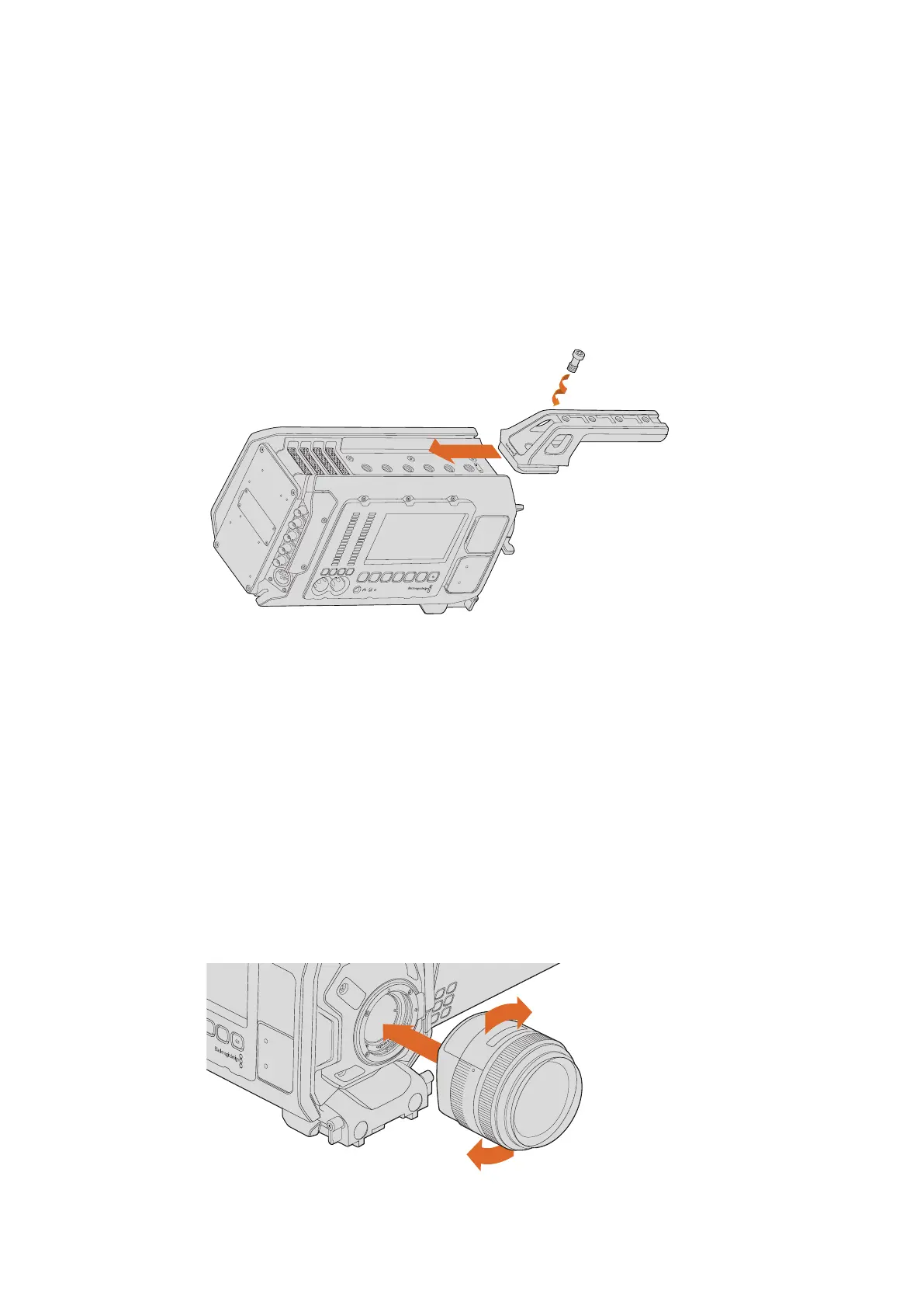 To attach Blackmagic URSA’s handle to the camera body, simply slide the base of the handle