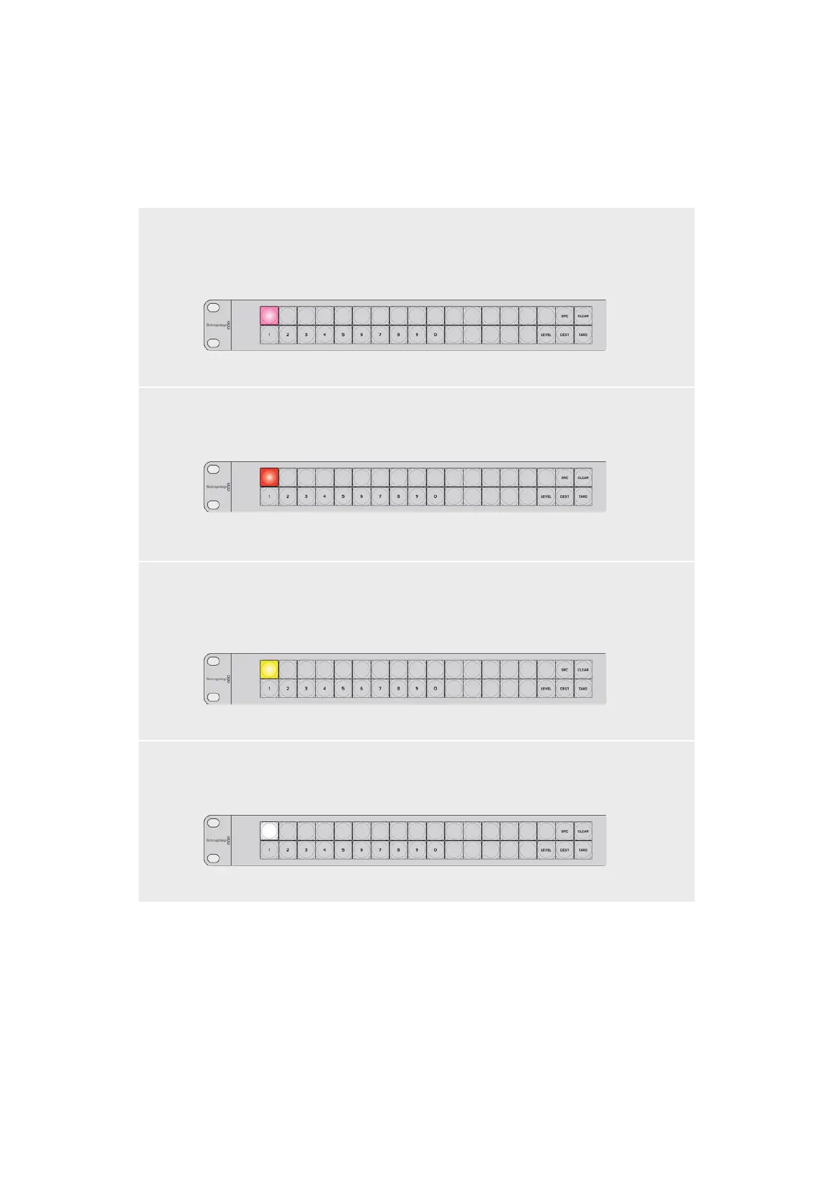 When power is first connected to a Videohub control panel, all the buttons will display their test