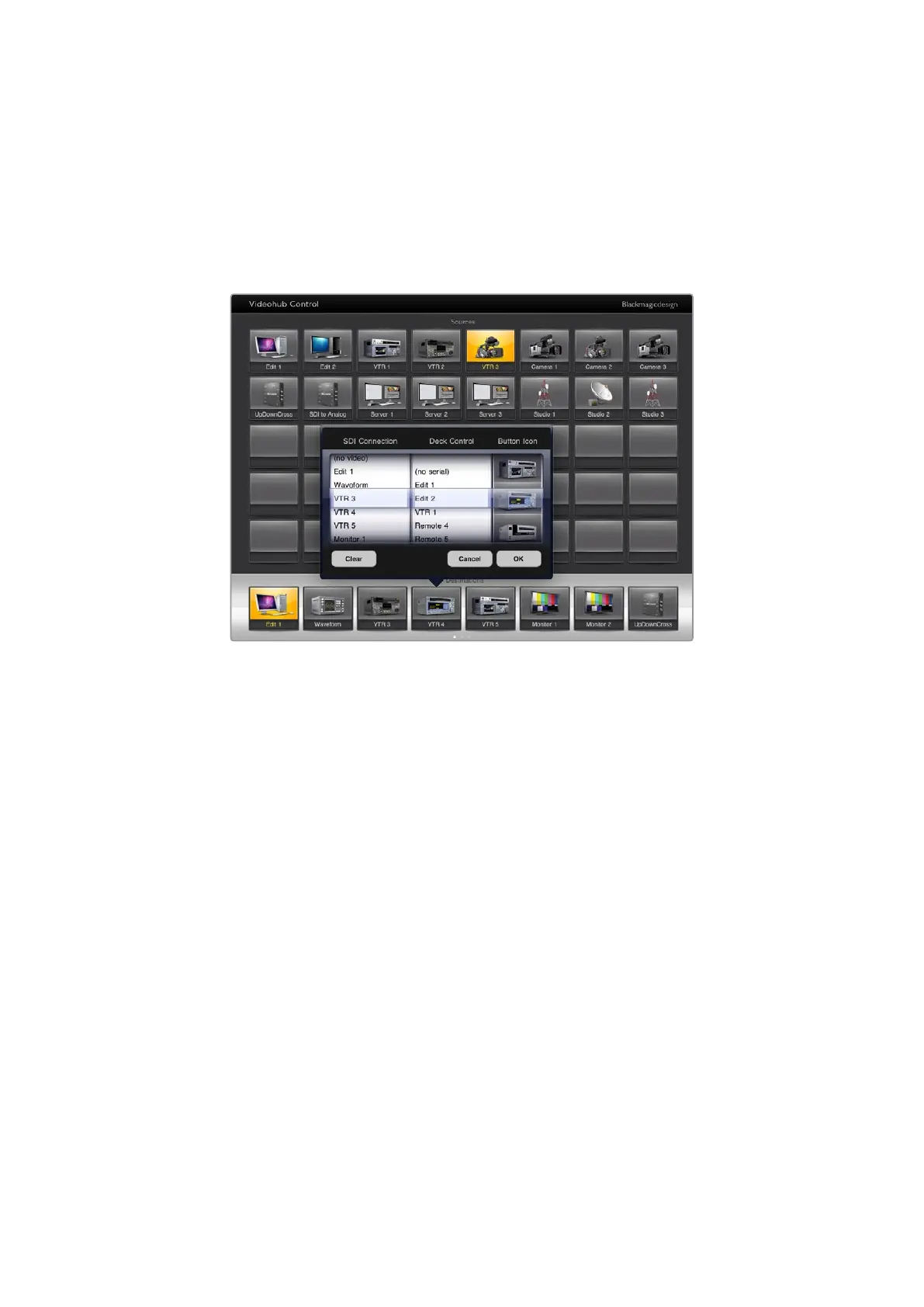The bottom-right source button is reserved by the Videohub app itself and cannot
