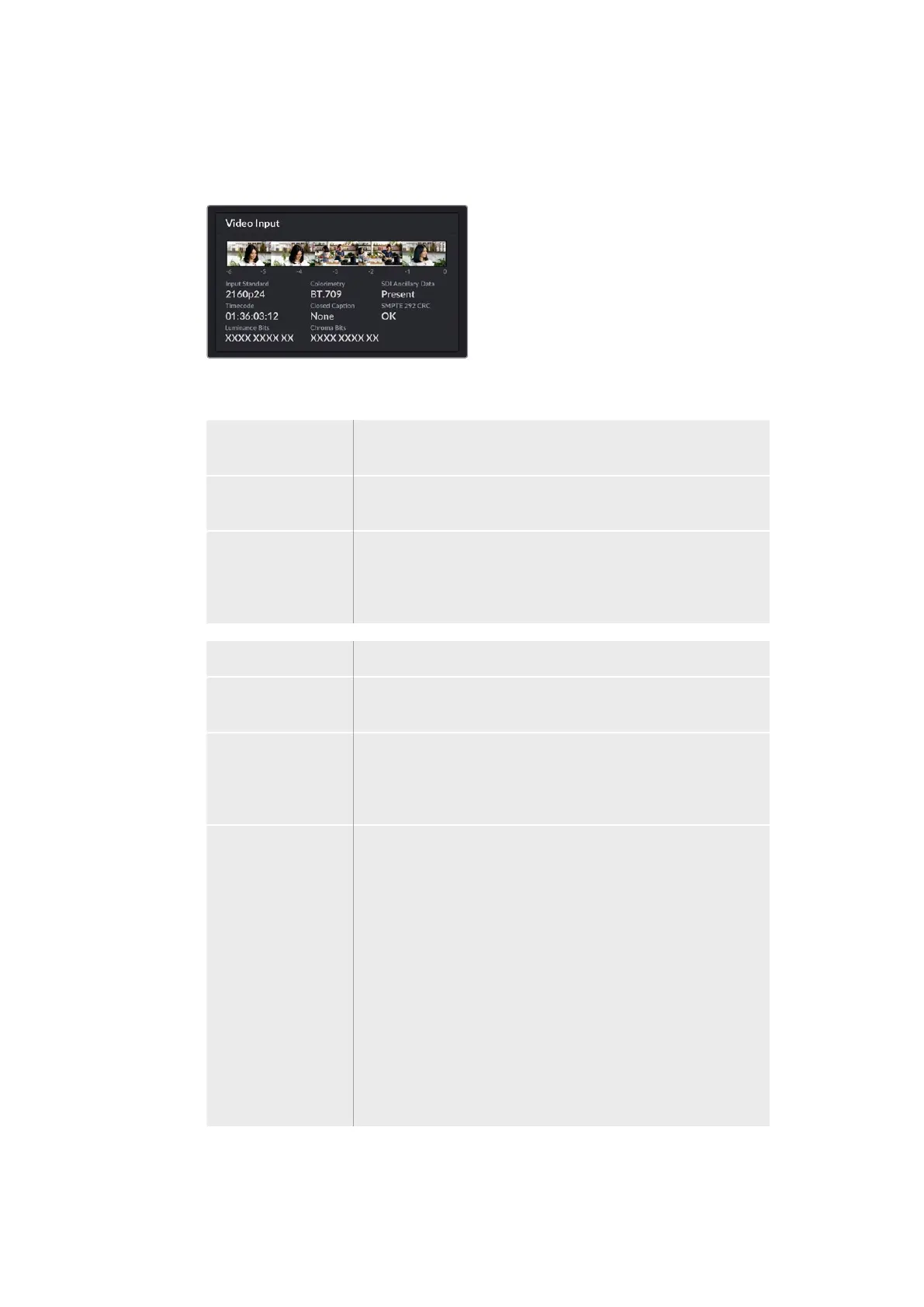 Input Standard Displays the resolution and frame rate of the SDI video input.