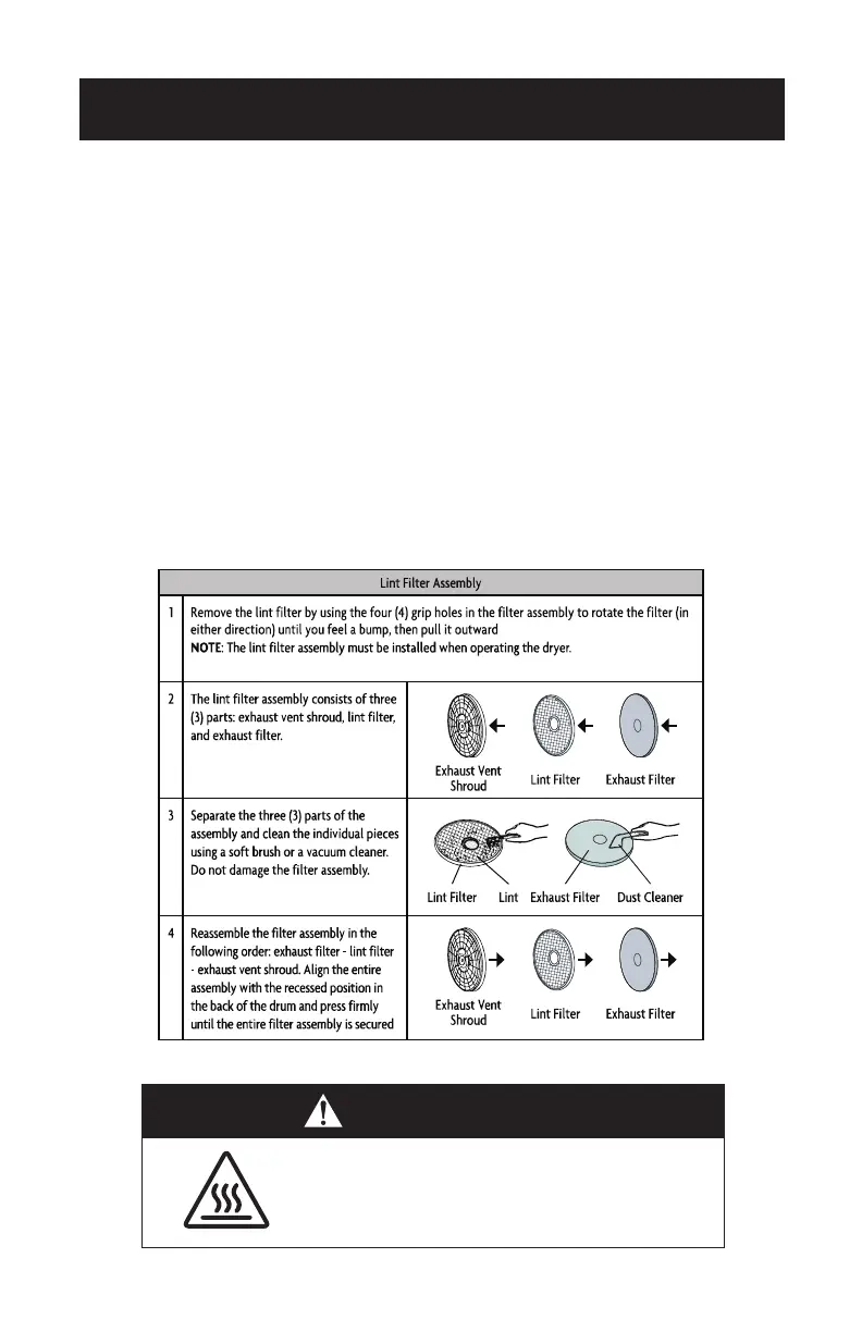 The lint filter assembly should be cleaned before or after each use. Refer to the chart