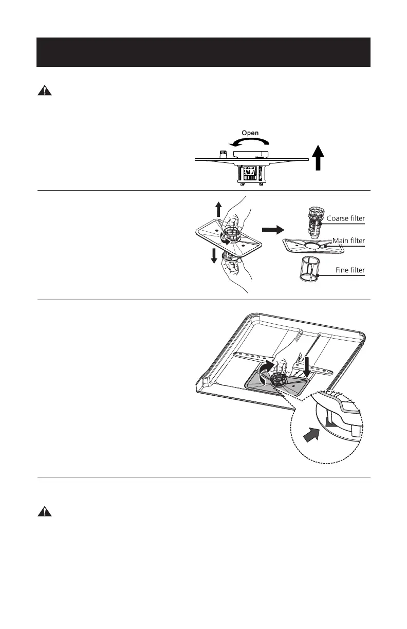WARNING: Never run the dishwasher without the filters in place. The dishwasher